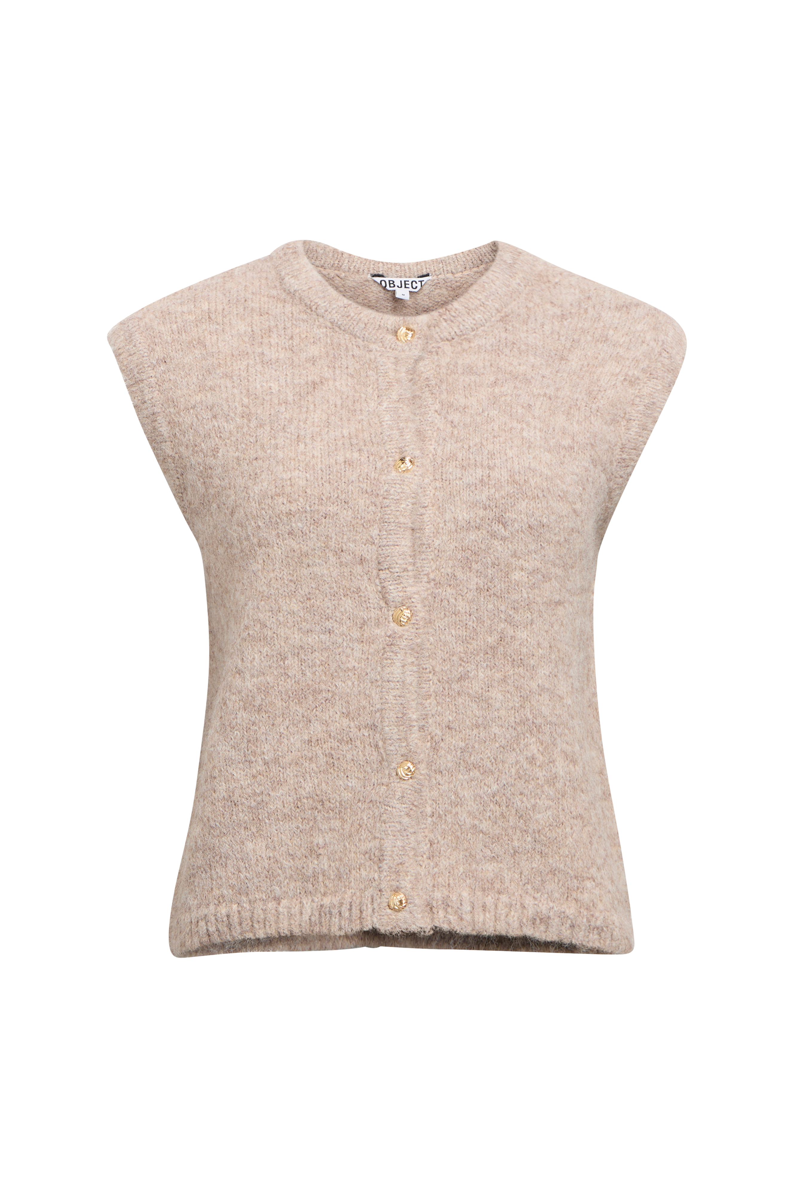 • Myk, strikket vest• Rund, ribbet hals• Gullfargede knapper foran• Smale, ribbestrikkede kanter