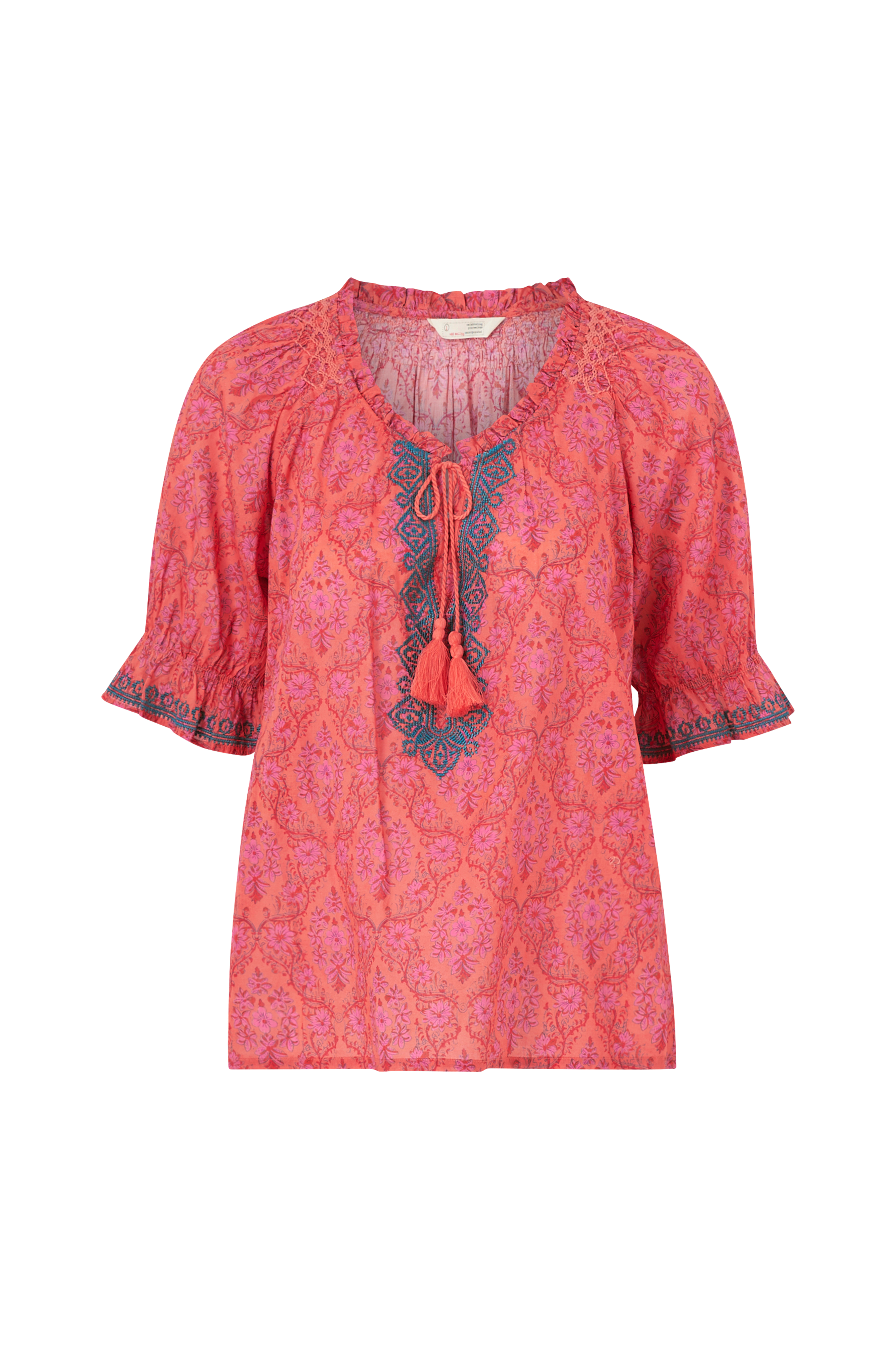 Vid modell med broderier på skuldre og hals med liten volangkant og splitt med lang knyting foran. Broderier også på brystet, og raglanermer med strikksømmer nederst.