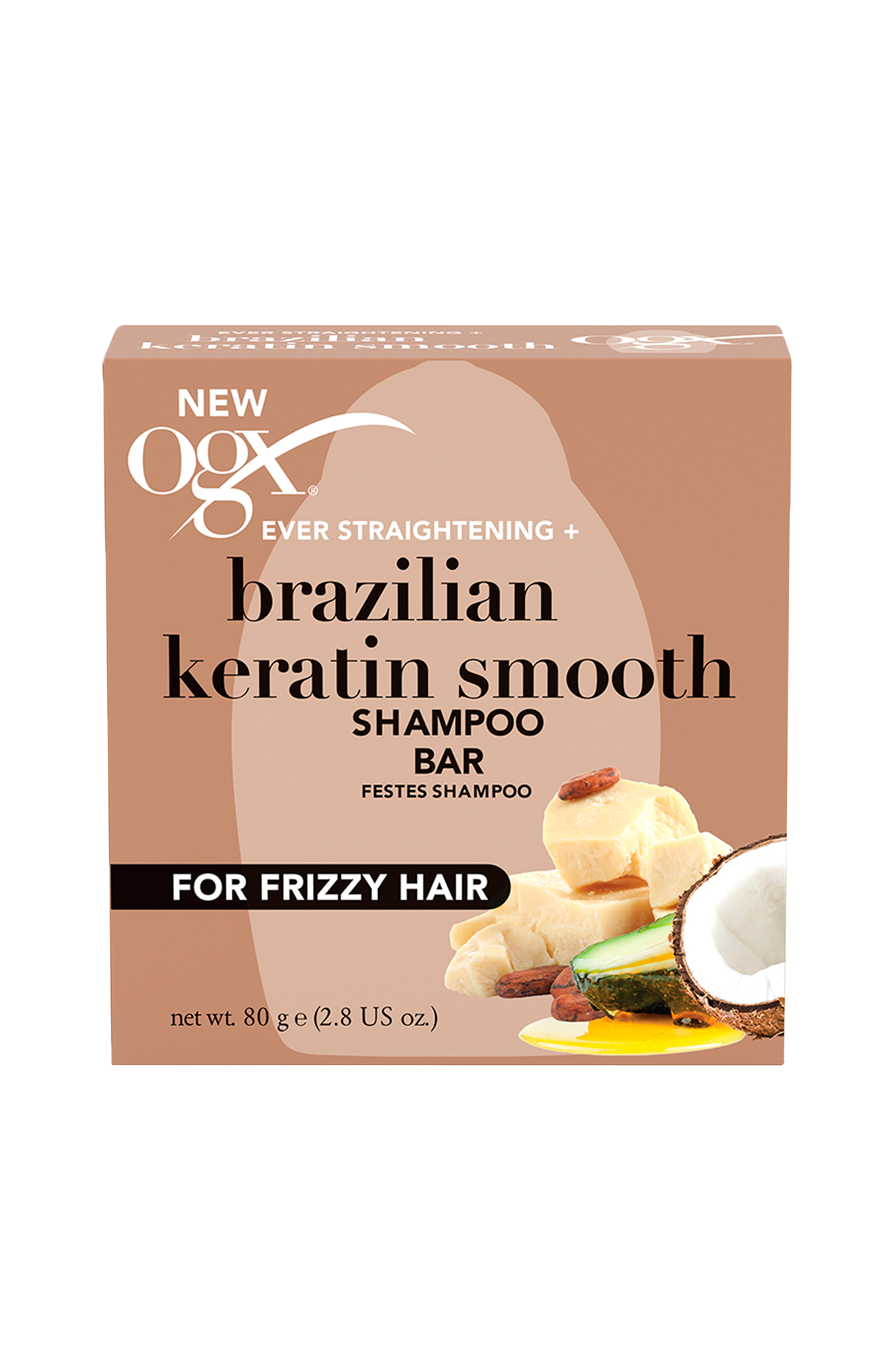 Ta vare på håret samtidig som du verner miljøet med OGX Brazilian Keratin sjampokake. Sjampo i fast form for daglig bruk som inneholder næringsrik kokosolje, styrkende keratinproteiner, utglattende avokadoolje og mykgjørende kakaosmør som sammen gjør håret glattere enn noensinne. Sjampo for statisk , krøllete eller bølgete hår som fukter og gjør håret sterkere samtidig som det får en vakker glans.
