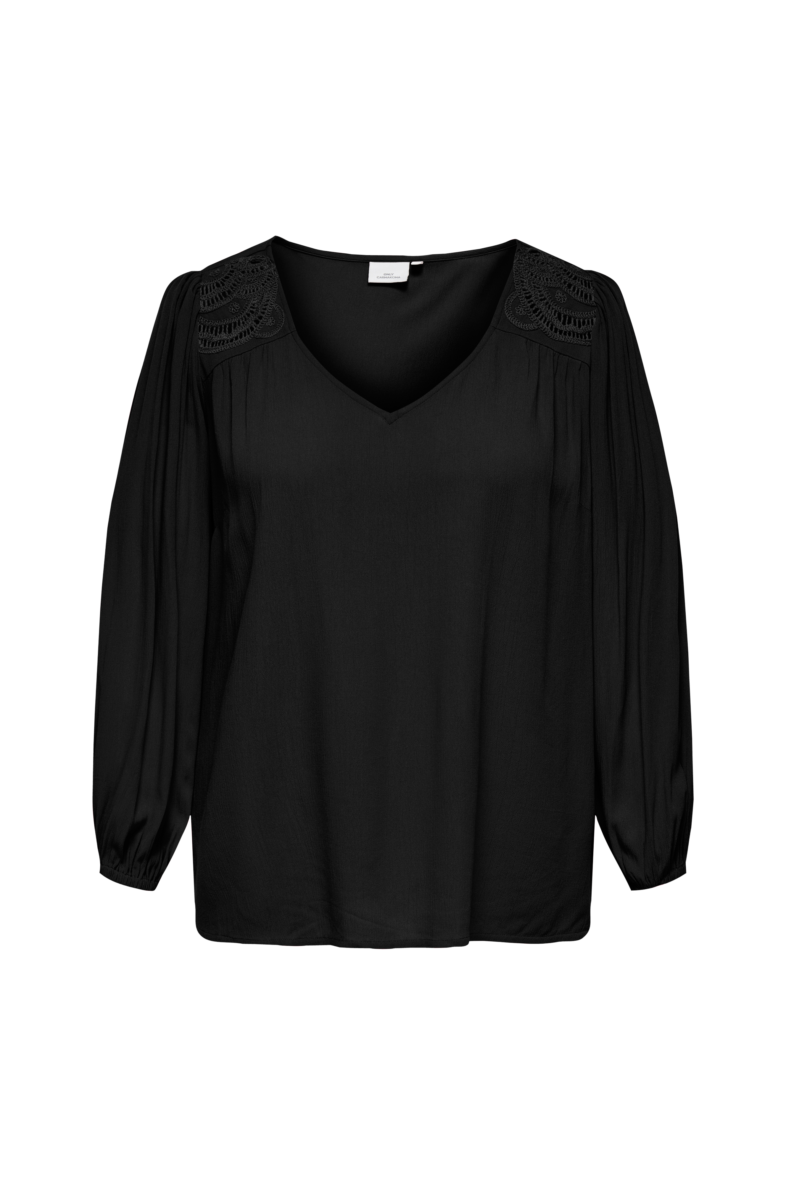 • Bluse i rynket materiale med hullbroderier på skuldrene• Løs passform• V-formet hals• Lange puffermer med gummistrikk i ermeslutten• Pluss-størrelser