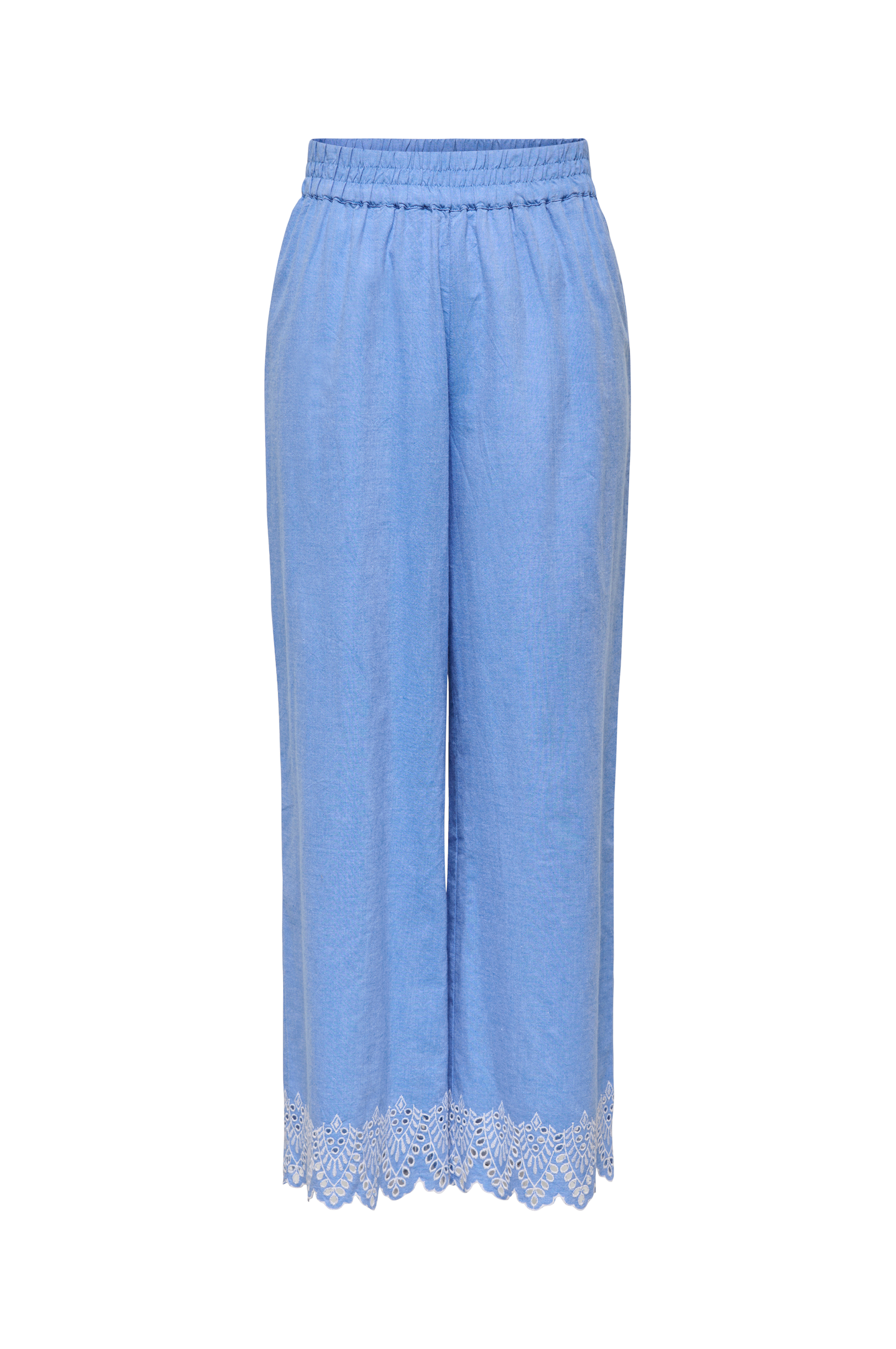 • Brede bukser• Elastisk midje• Sidelommer• Hullbroderi i enden av benet• Pluss-størrelser• Indre benlengde: 77 cm i størrelse 42
