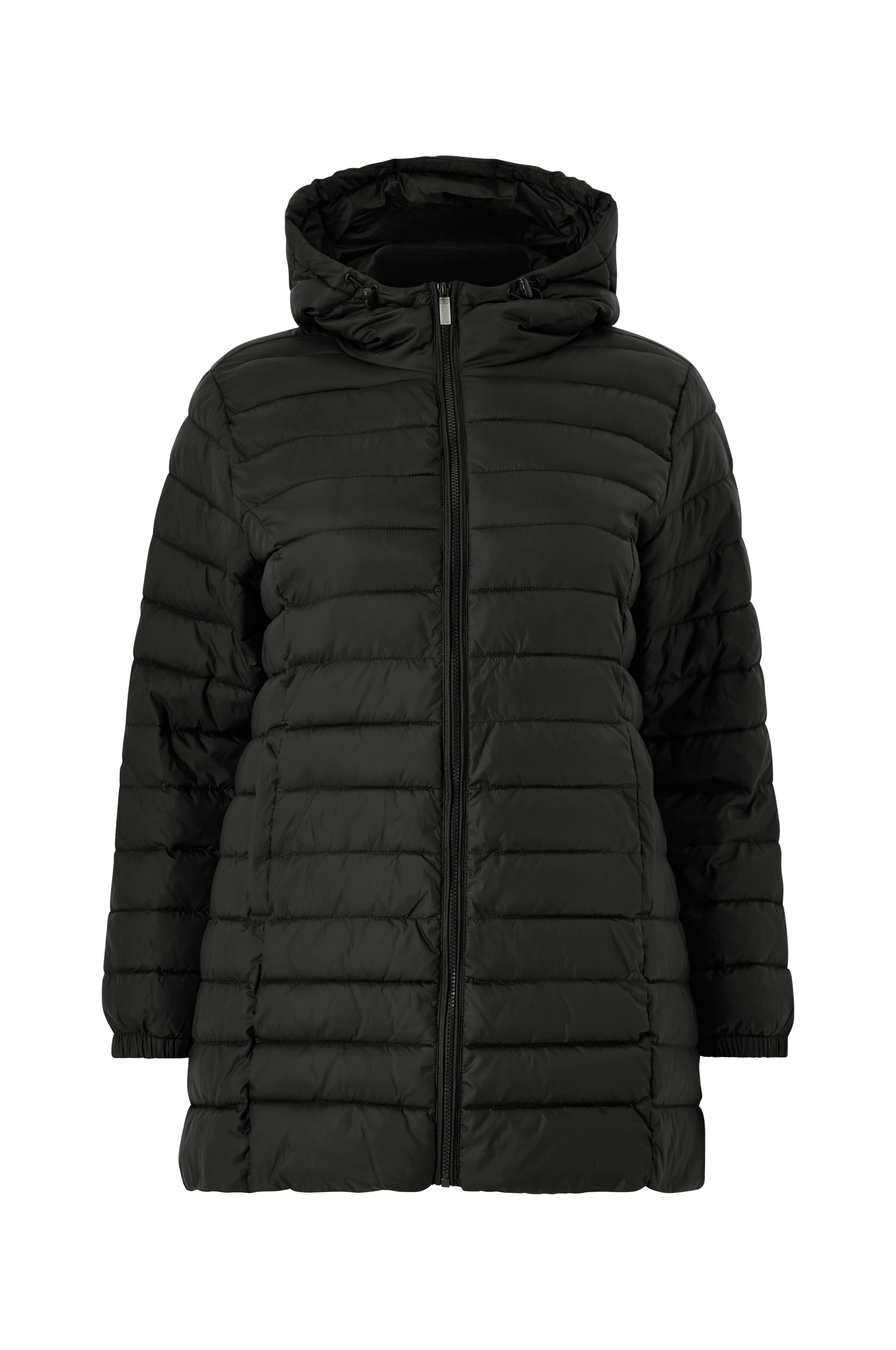 • Plusstørrelser • Polstre, vattert modell • Lang glidelås foran • Høy krage • Hette med snøring • Innfelte lommer • Elastisk strikk i ermeslutten • Lengde: 80 cm i størrelse S