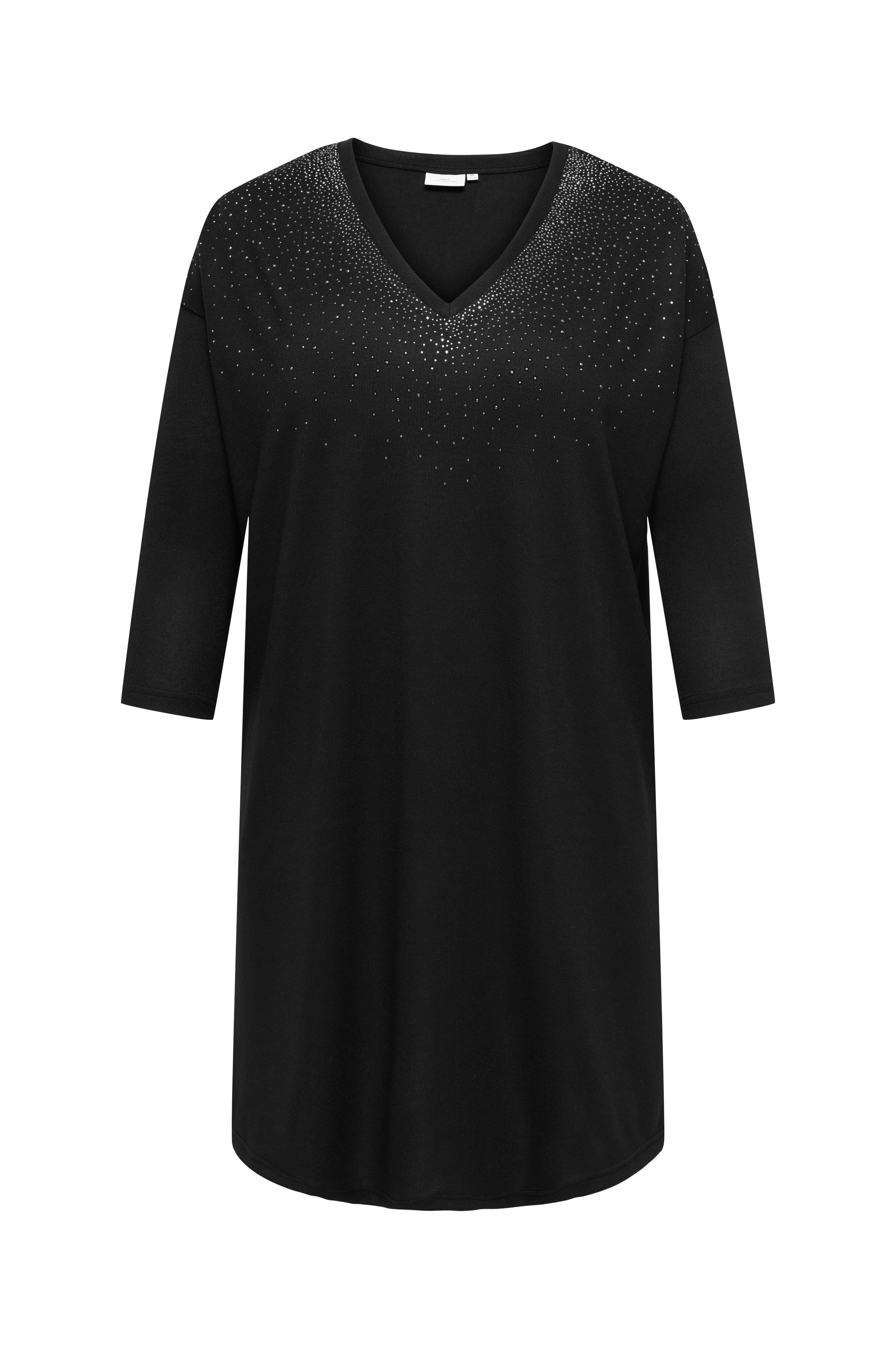 • Myk, stretchy kjole• Ribbet, v-formet hals• Dekorative rhinstener oppover foran• Ermer 3/4 lang• Lengde: 98 cm i størrelse S• Pluss-størrelser