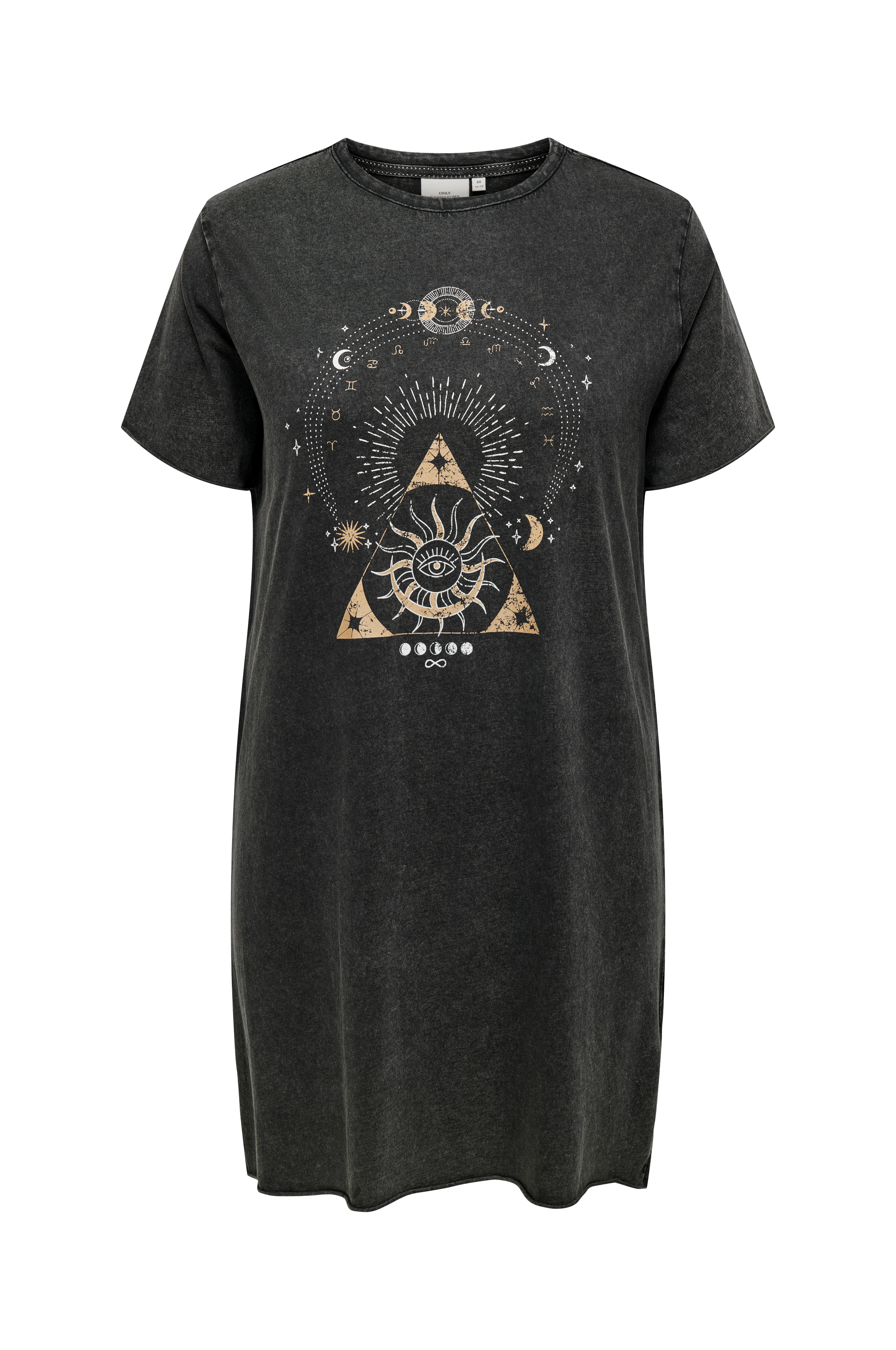 • T-shirtkjole• Rund halsringning• Glitrende trykk foran• Rå, rullede kanter i ermeslutten og på bunnen• Plusstørrelser• Lengde: 95 cm i størrelse 42/44