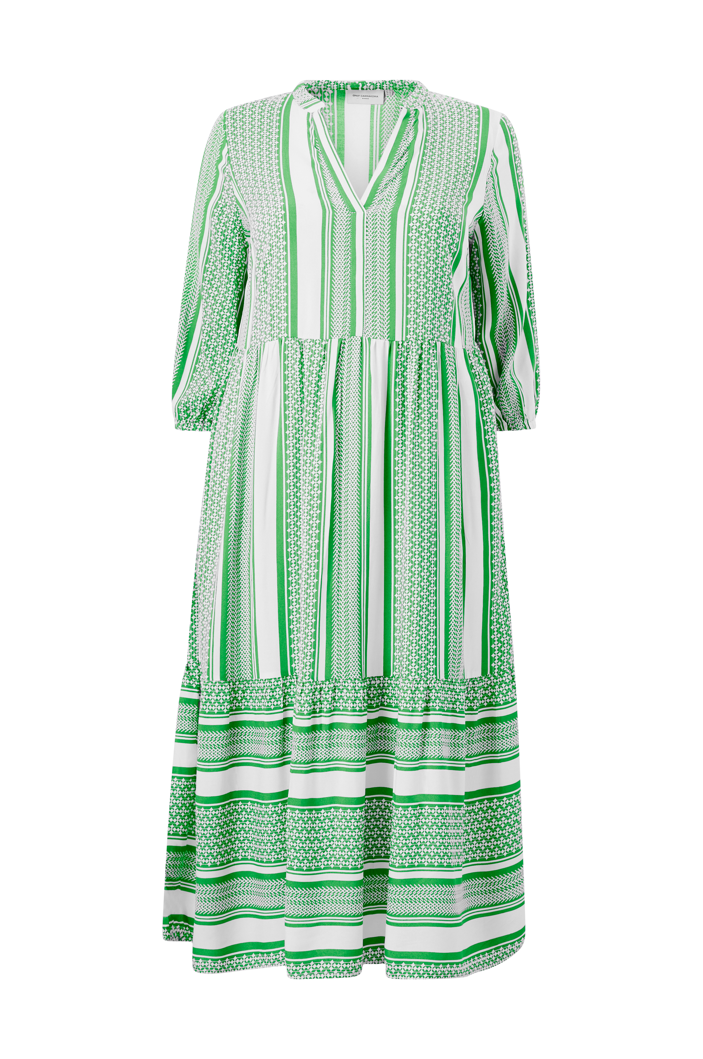 Kjole carMarrakesh 3/4 Calf Dress från Only Carmakoma. Mønstrete modell med dyp V-utringning i halsen og påsydd kant i nakken. Vide erme med innfelt strikk i ermekantene, avskjæring i midjen med vidde i skjørtet og påsydd volang i nederkanten. Vevd kvalitet med trykt mønster og fint fall. Lengde ca. 132 cm i str 44..
