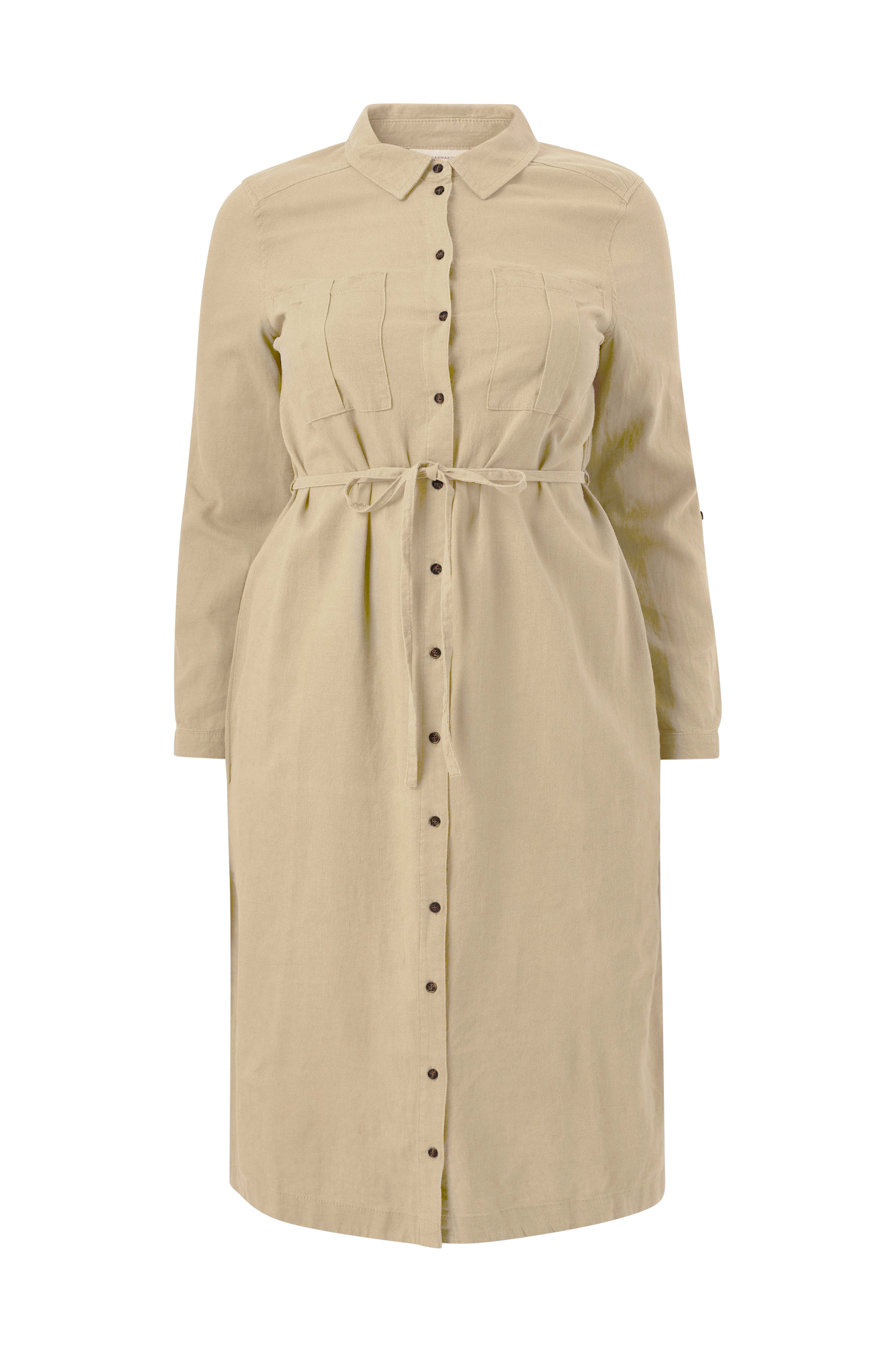 • Kjole i linmiks • Knapper oppover foran • Lange ermer med knapp for opprulling • To brystlommer • Knytbar tråd ved midjen • Splitt i sidene • Plusstørrelser • Lengde: 116 cm i størrelse 42