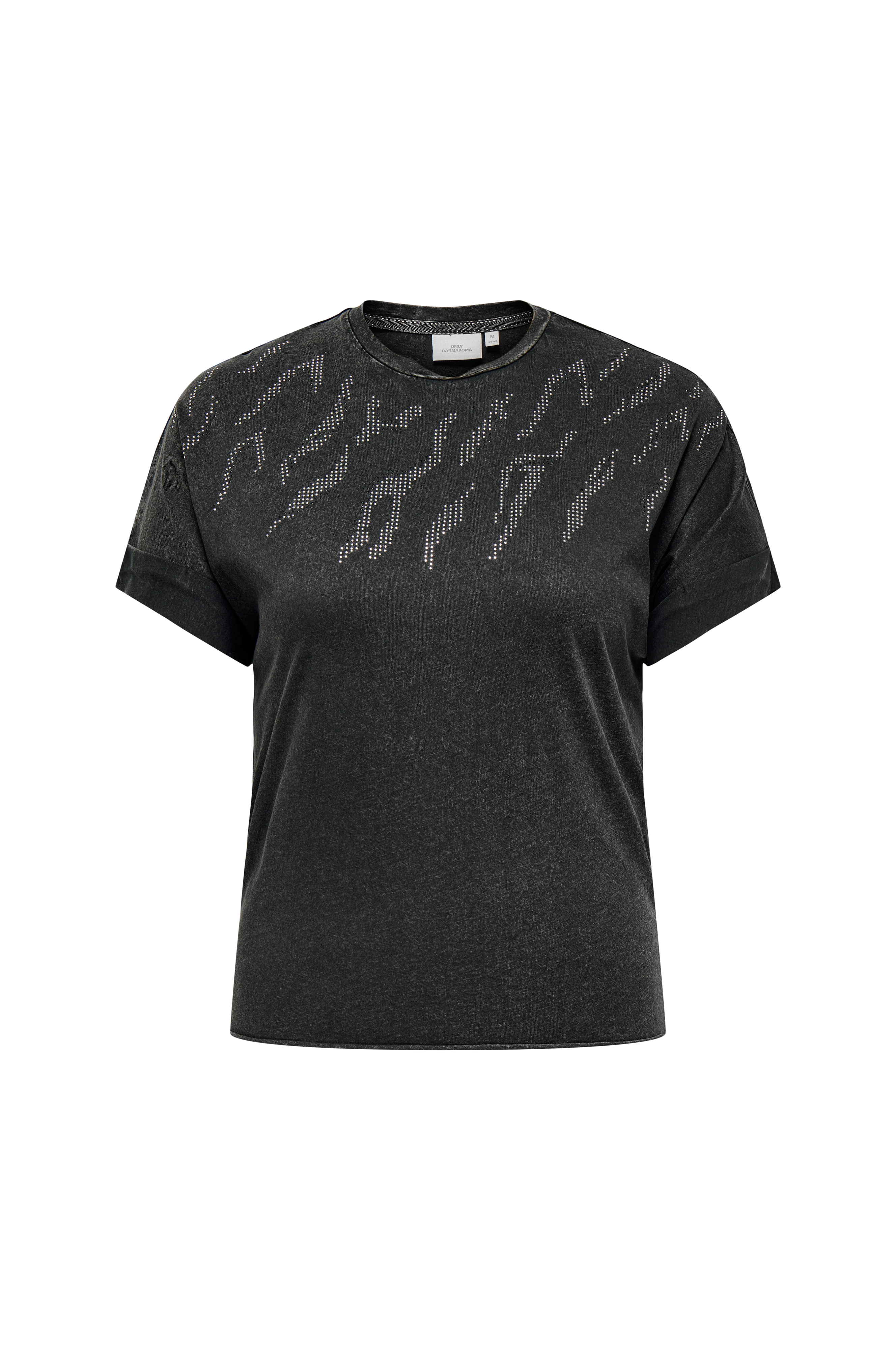 • Myk, stenvasket t-skjorte i bomull• Rund, ribbet hals• Dekorative steiner oppover foran• Oppbrettede ermeender• Rå, opprullet hem• Pluss-størrelser