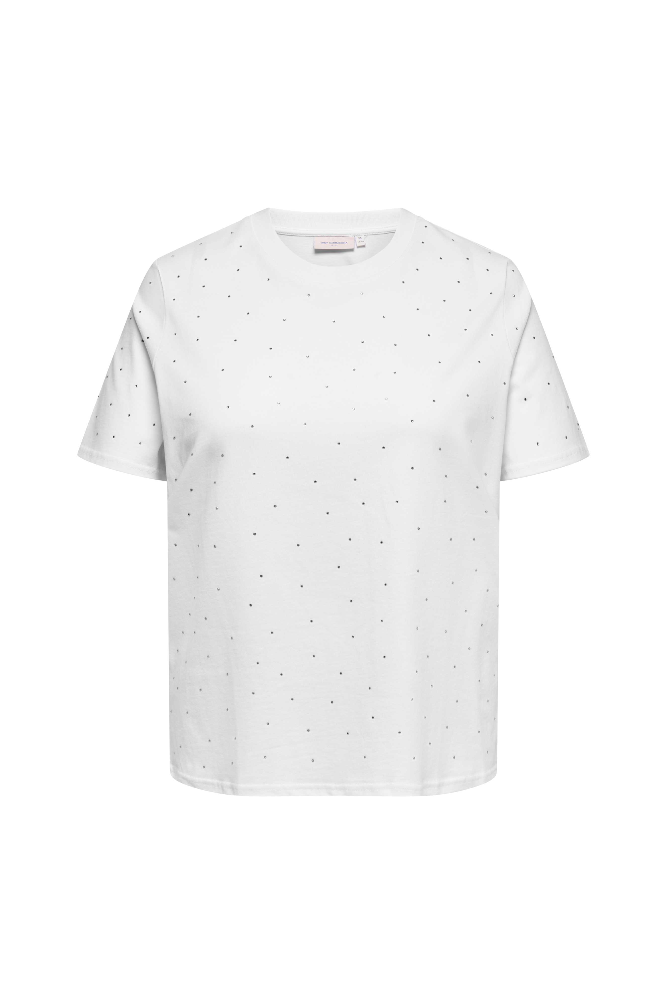 • Myk t-skjorte i bomull• Rund, ribbet hals• Glitrende rhinstener foran og rundt ermene• Pluss-størrelser
