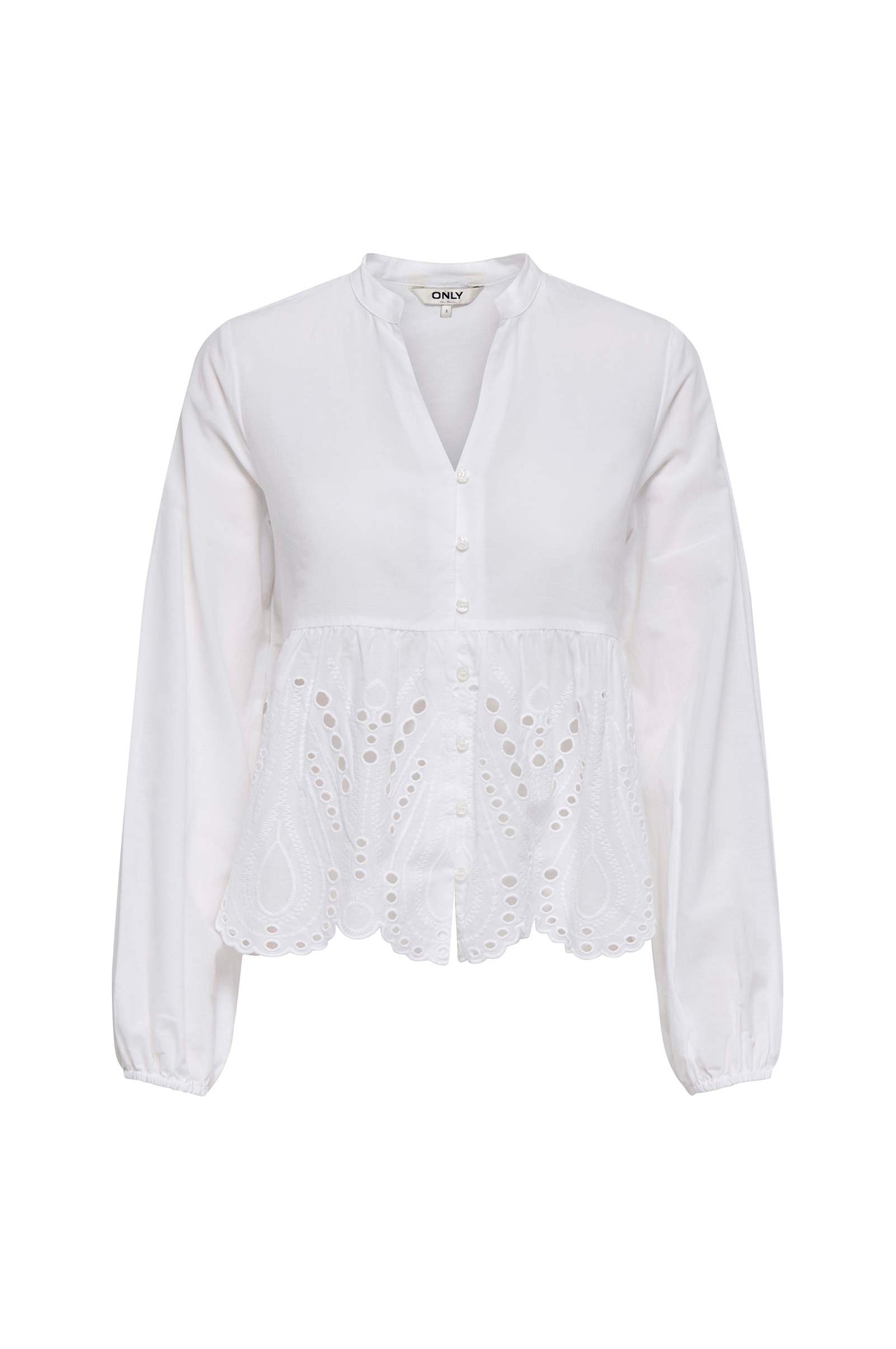 • Peplum-design• V-hals snitt• Knapper foran• Brodert hullmønster på bunnen• Elastiske mansjetter