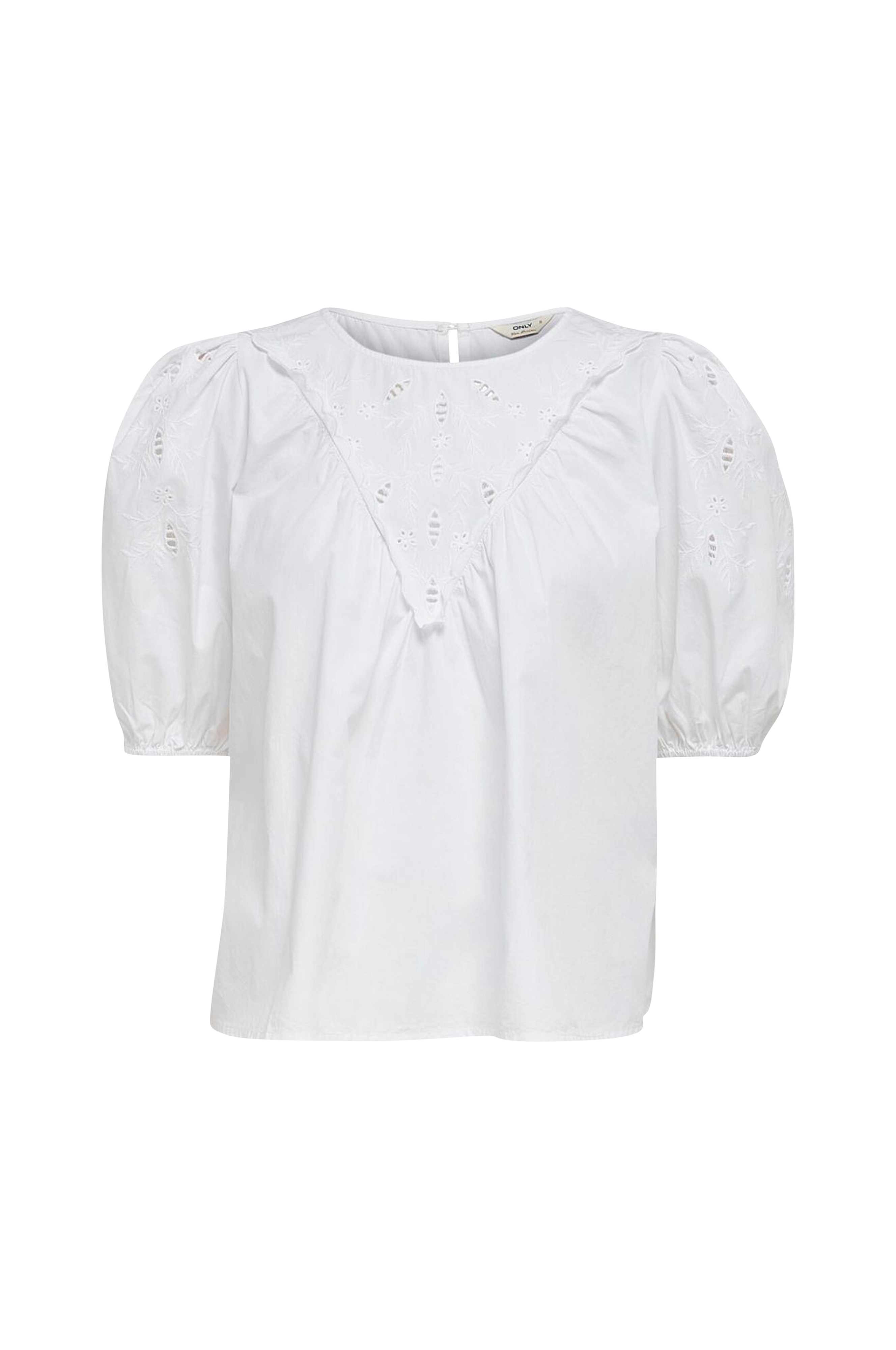 Bluse i vevd kvalitet med hullbroderi øverst foran og på ermene. Dekorativt bærestykke med rynker bak samt splitt og knapp i nakken. Halvlange ballongermer med elastiske ermekanter.