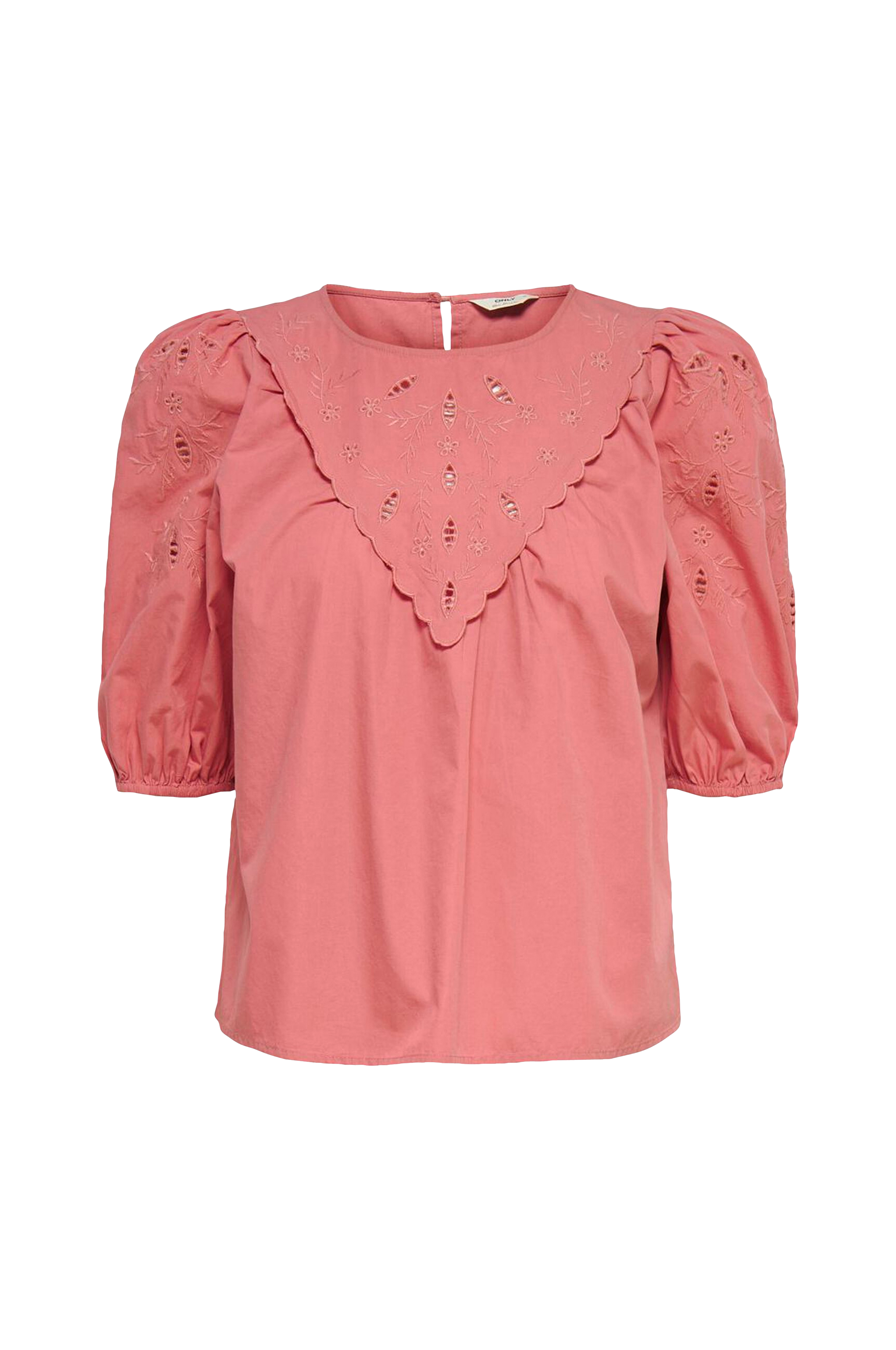Bluse i vevd kvalitet med hullbroderi øverst foran og på ermene. Dekorativt bærestykke med rynker bak samt splitt og knapp i nakken. Halvlange ballongermer med elastiske ermekanter.