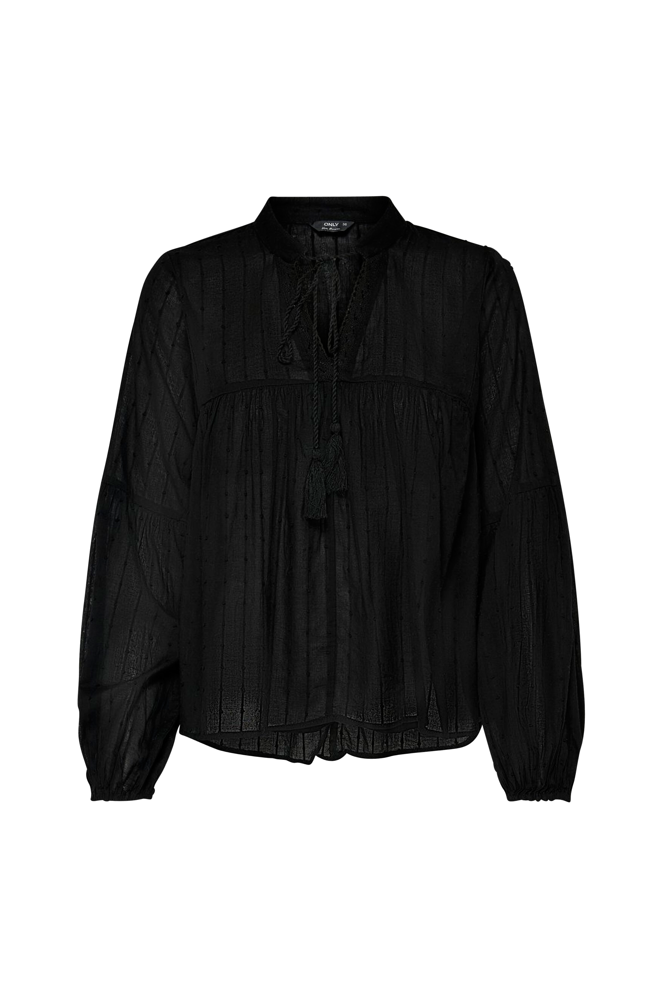 Bluse onlNew Elisa Life LS fra Only i vevd, lett og halvtransparent bomullskvalitet med strukturstriper og strukturprikker. Rund hals med knytebånd og V-splitt foran med blondekant. Strikk i ermekantene. Lenger bak.