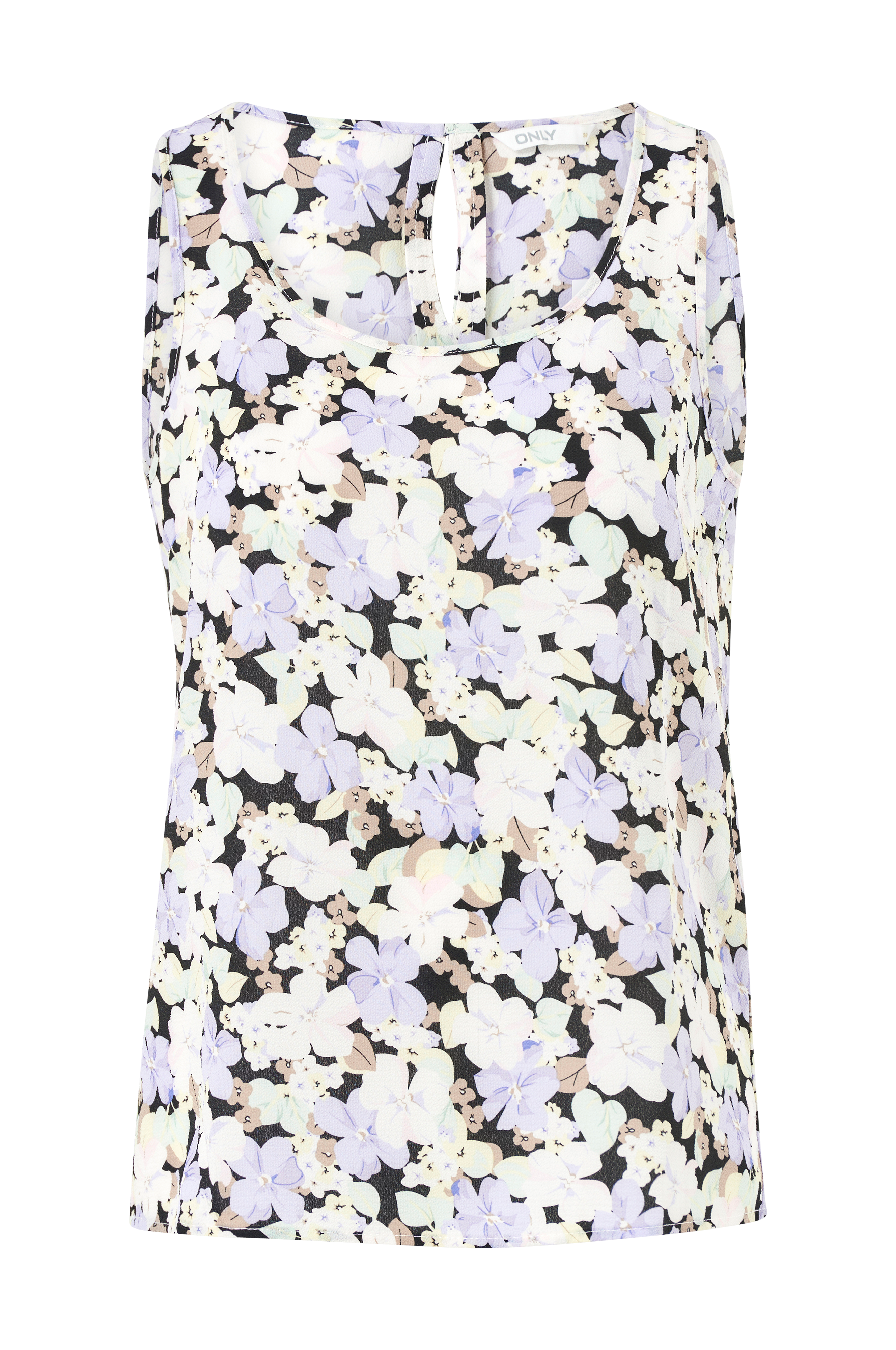 Ermeløs bluse i vevd, kreppet kvalitet. Rund hals med splitt og knapp bak.