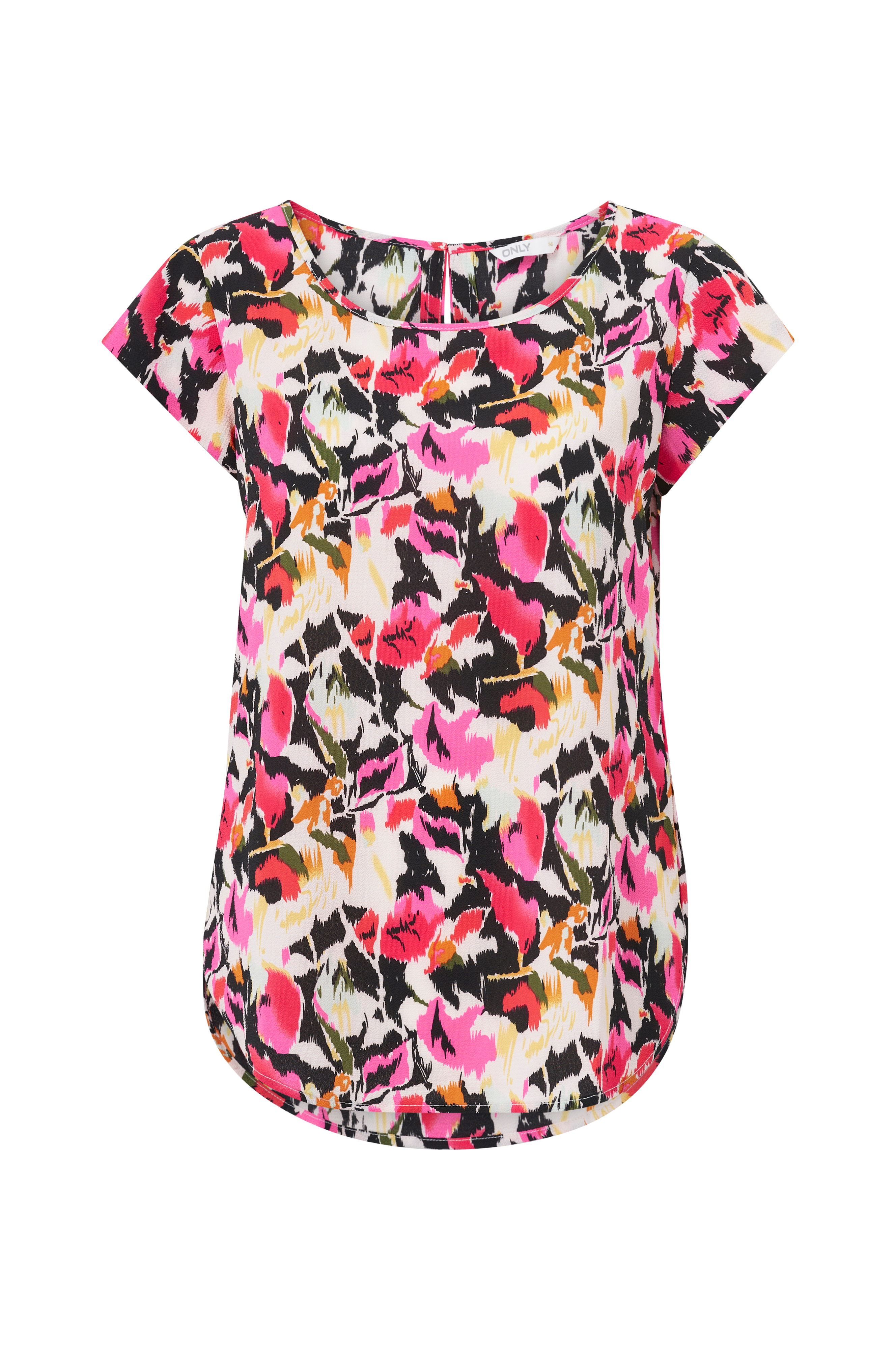 Mønstret bluse i vevd, kreppet kvalitet. Korte ermer og rund hals med splitt og knapp i nakken. Avrundet nederkant.