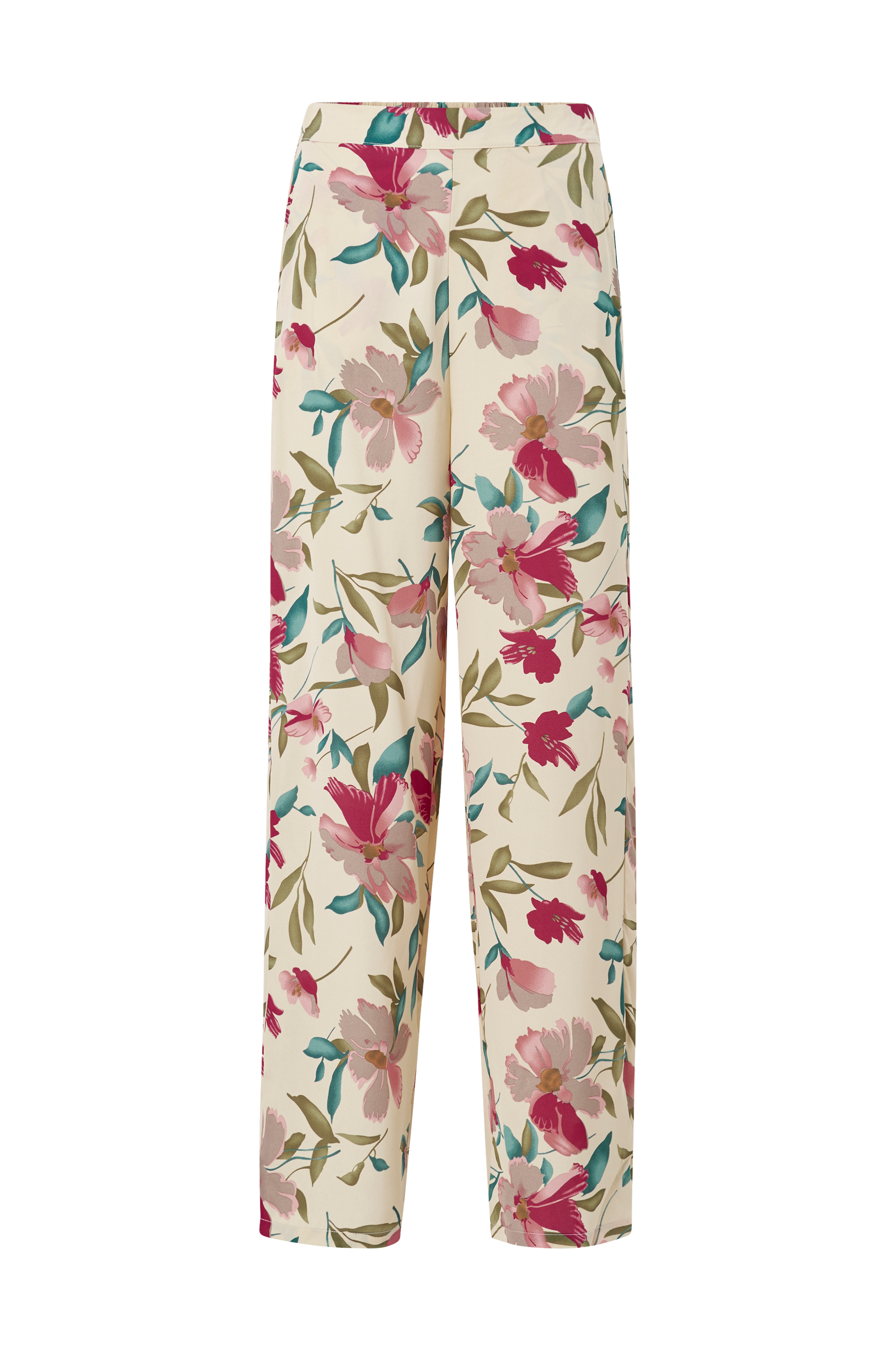 Vid, mønstret bukse i vevd kvalitet. Dra-på-modell med rynket strikk i midjen bak. Indre benlengde ca. 75 cm i str 36.