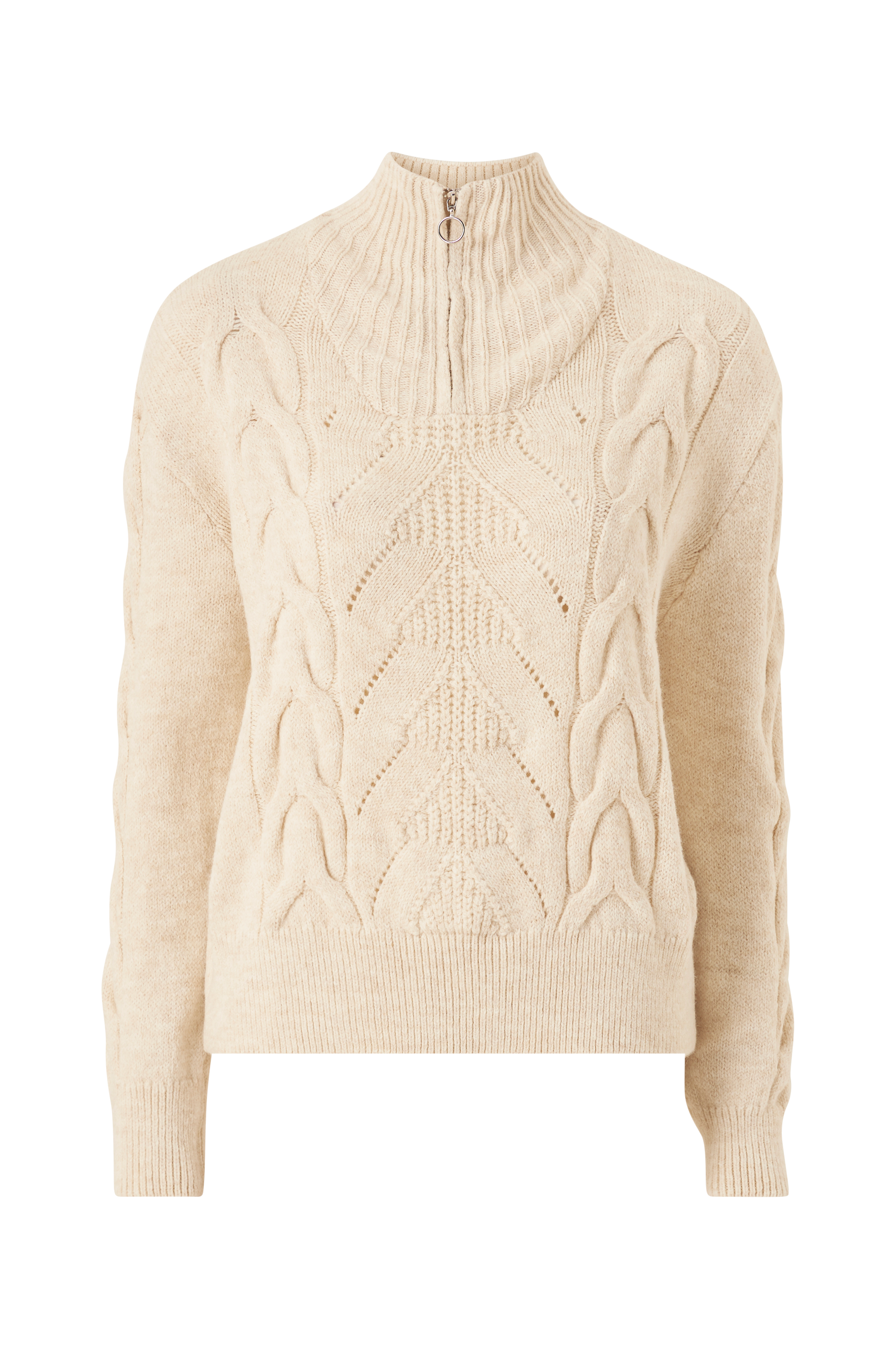 • Myk, strikket kvalitet• Ribbestrikket høy krage med glidelås• Kabelstrikk foran• Glatt bakside