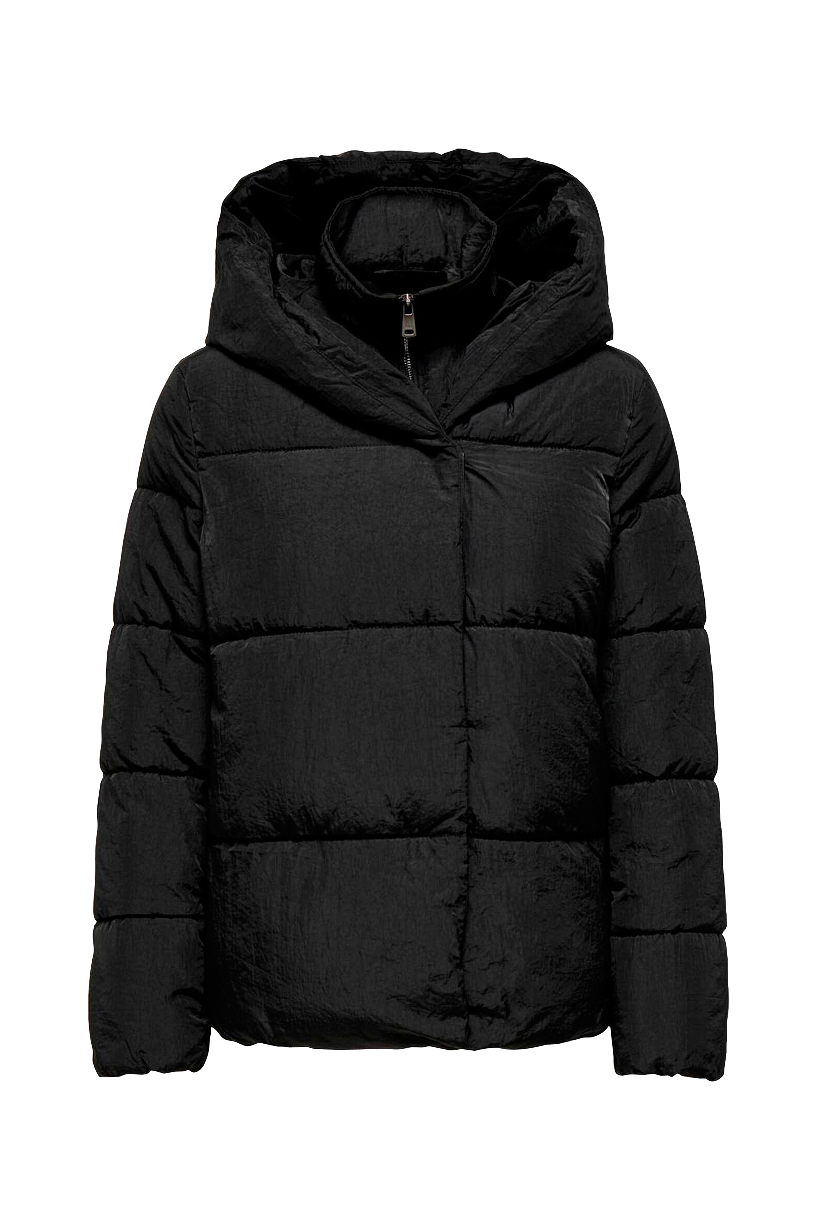 • Vattert, vattert jakke • Ytterstoff med lett struktur • Fast hette • Høy krage • Glidelås • Trykknapper • To lommer med trykknapper • Elastisk strikk i ermeslutten • Lengde: 66 cm i størrelse S
