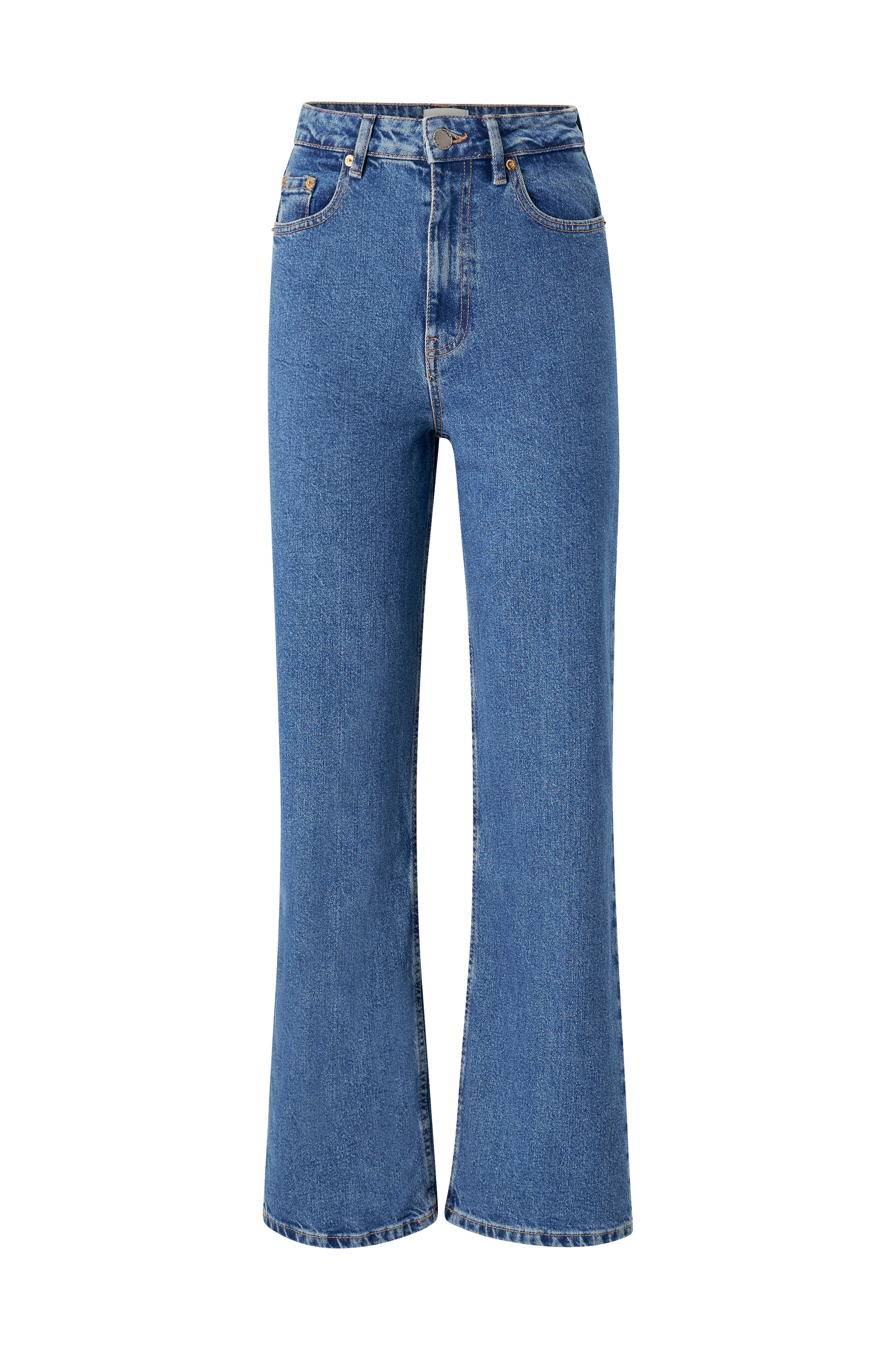 Jeans i stretchdenim med ekstra høy midje og vide ben. Femlommersmodell med glidelåsgylf.
