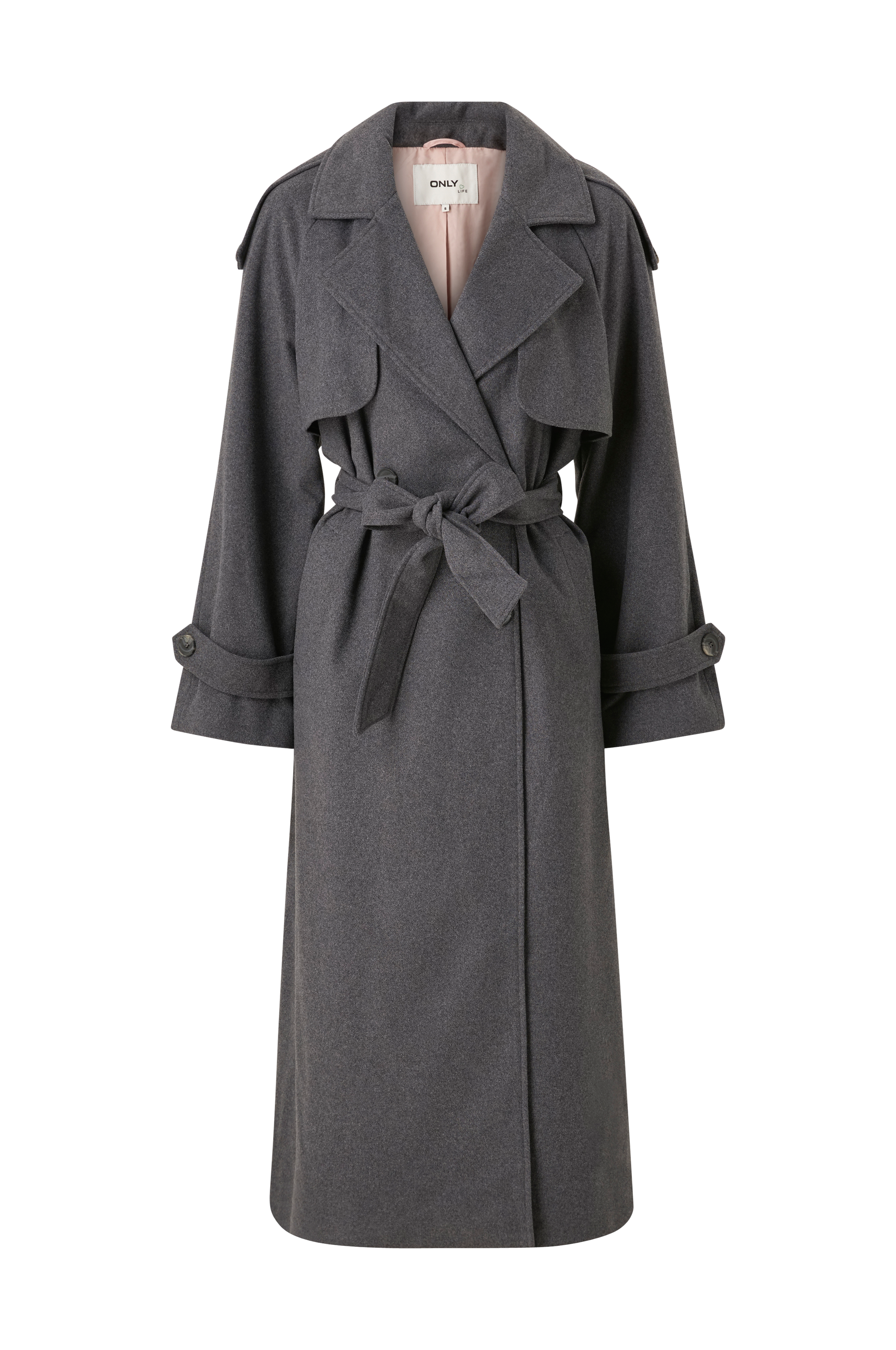 • Filtet trenchcoat i ullblanding • Skulderklaffer • Dobbelbryst modell • Avtakbart knytbart belte ved midjen • Knappedetaljer i ermeslutten • To lommer • Vevd foring • Ventilasjon nedover ryggen • Lengde: 130 cm i størrelse S