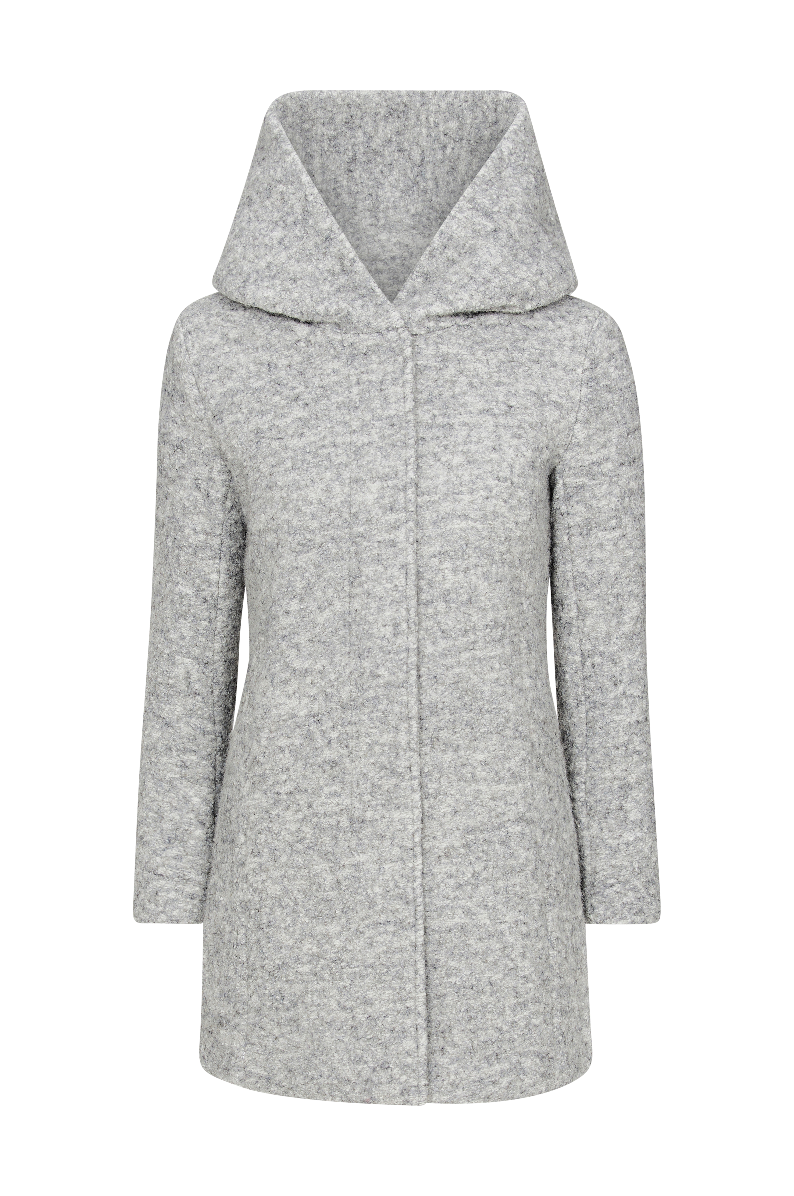 Kåpe onlSedona Boucle Wool Coat fra Only. Lett figurformet modell med stor, herlig hette og knappestolpe med skjult glidelås og skjulte trykknapper. Pene, langsgående sømmer med innfelte lommer foran. Vevd ullblanding med fin boucléoverflate, vevd fôr og tynne skulderputer. Lengde ca. 77 cm i str 76.