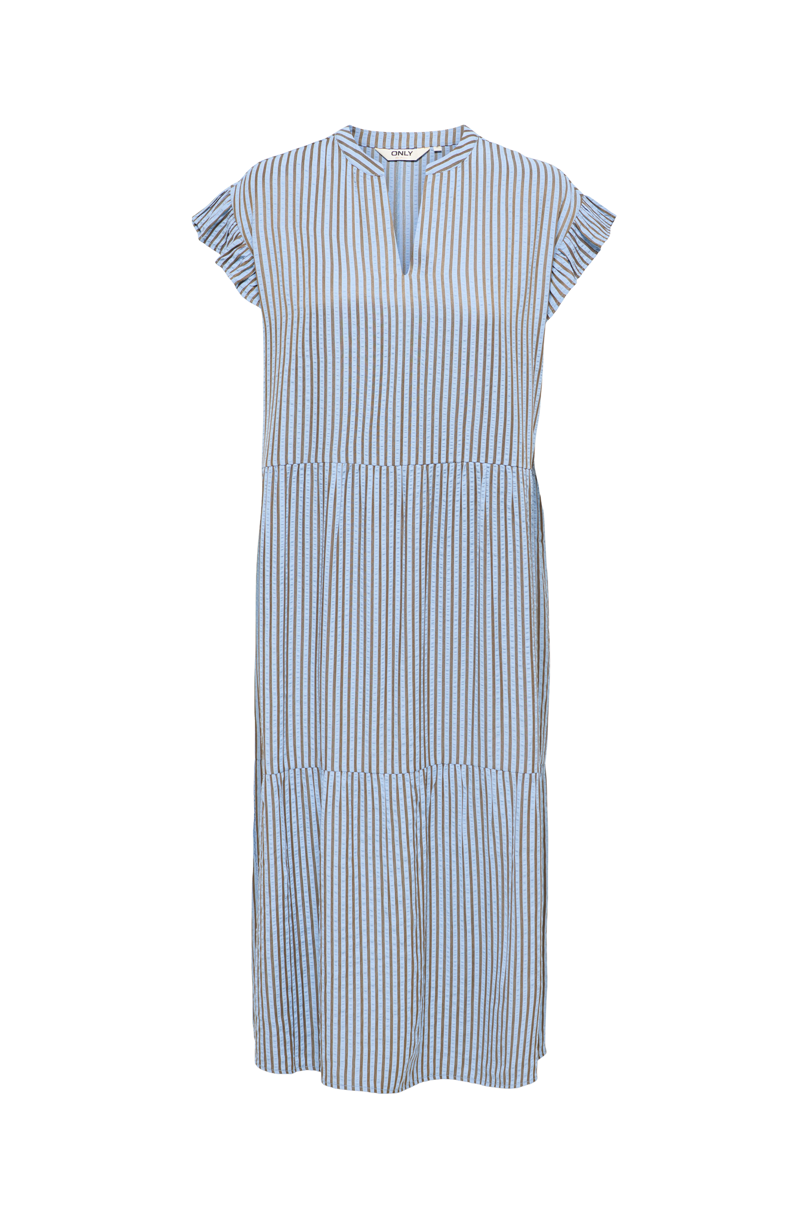 • Stripete midikjole• Volanger på skuldrene• V-hals snitt• Lengde: 116 cm i størrelse S
