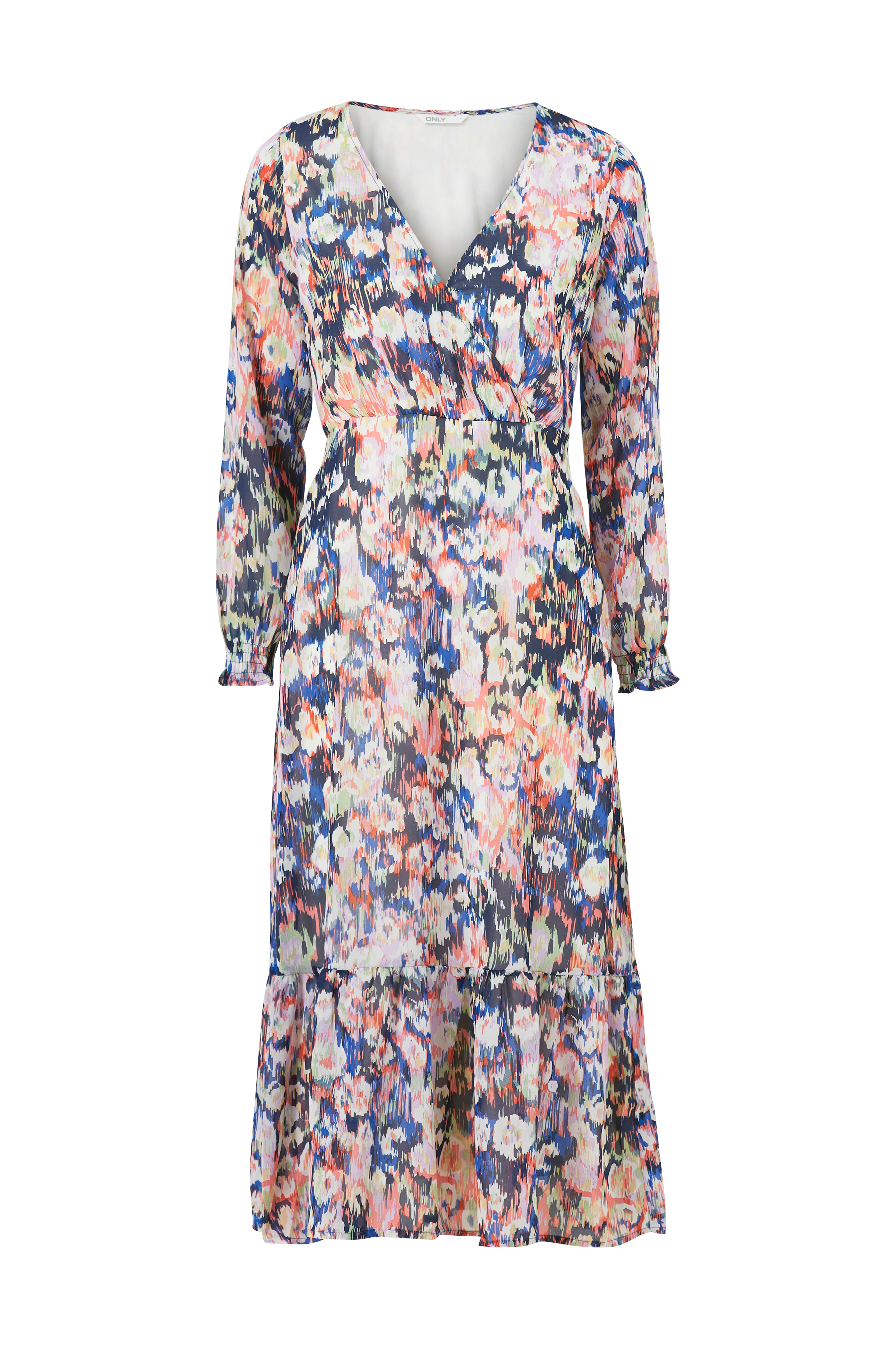 Lett figurformet modell med omslagsskåret overdel og avskjæring rundt i midjen. Lange ermer med strikksømmer i ermekantene og bred, påsydd volang i skjørtets nederkant. Vevd chiffon. Lengde ca. 125 cm i str S.
