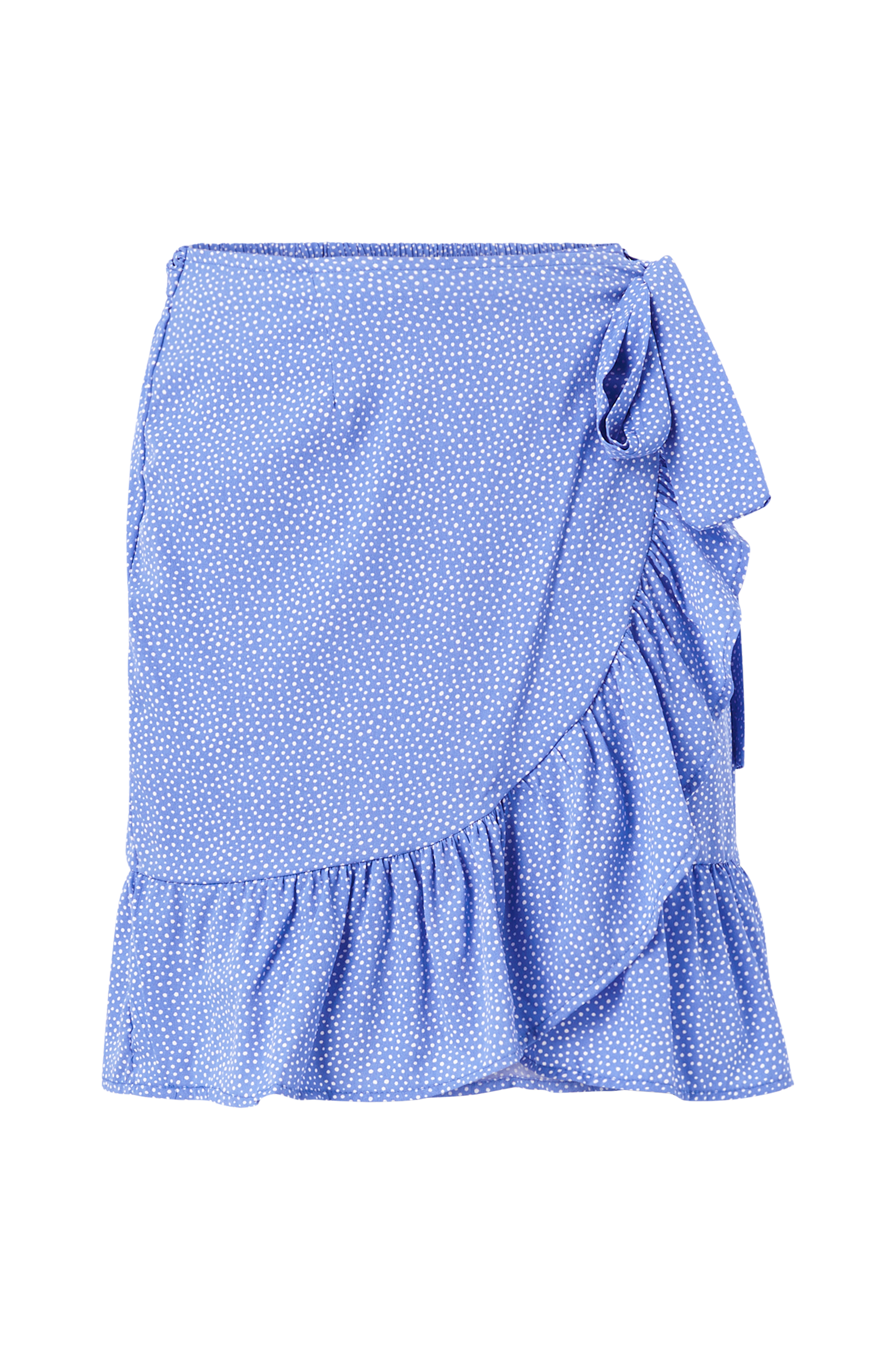 Kort omslagsskjørt med knyting i den ene siden og volang langs for- og nederkant. Strikk bak i midjen. Lengde ca. 45 cm i str S.