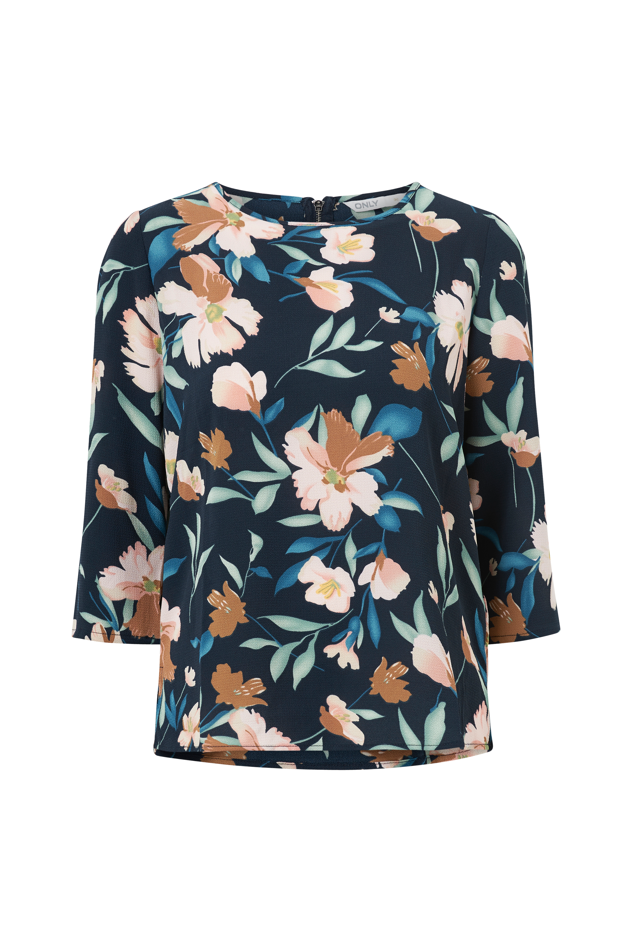 Topp i vevd kreppkvalitet med rette, 3/4-lange ermer. Rund hals med liten, påsydd kant og synlig glidelås i nakken.