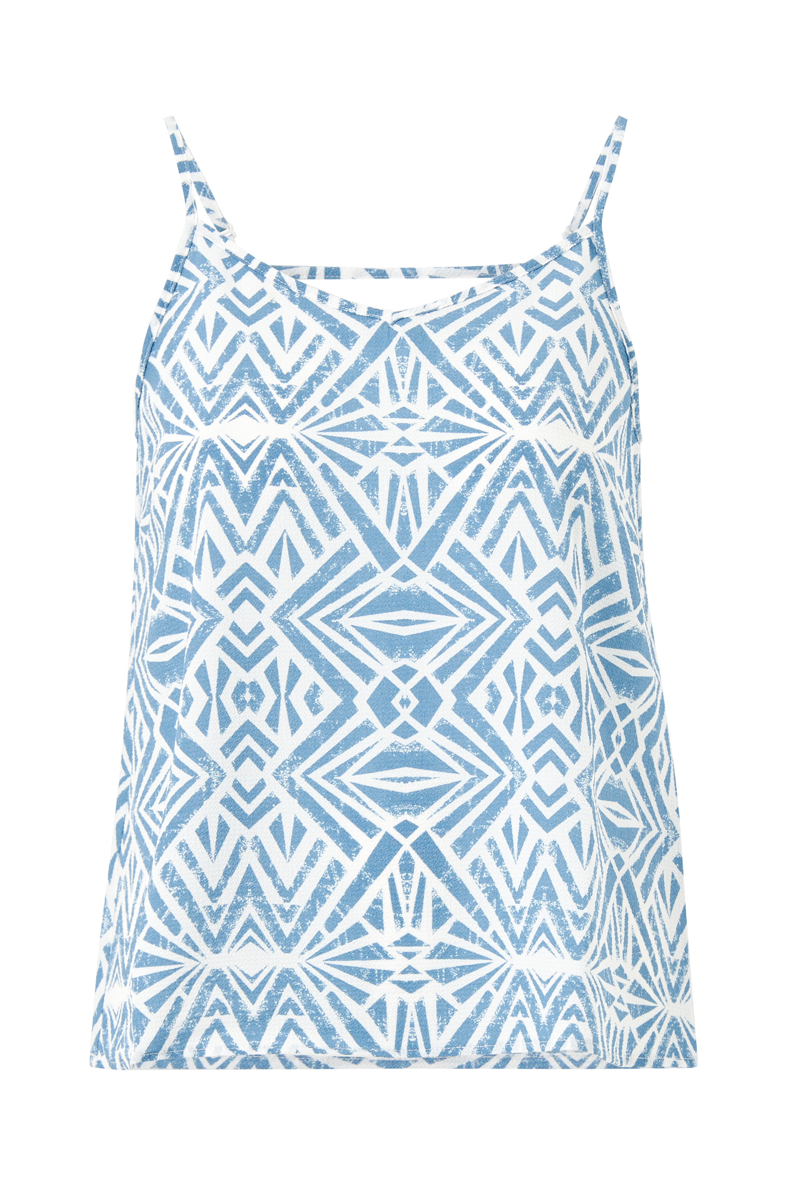 Singlet i vevd, kreppet kvalitet. V-utringet både foran og bak. Justerbare skulderbånd og dekorativt bånd i nakken.