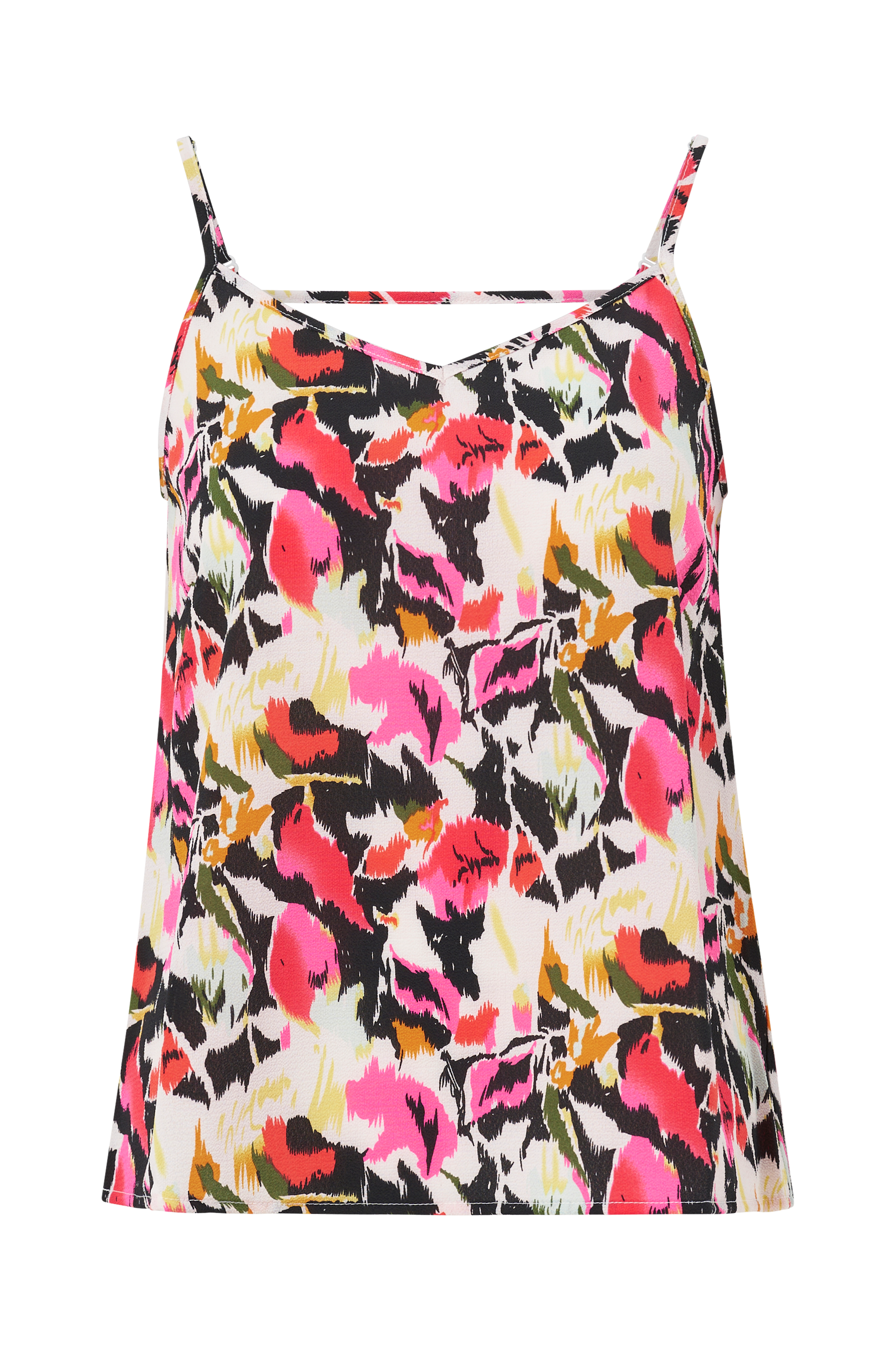 Singlet i vevd, kreppet kvalitet. V-utringet både foran og bak. Justerbare skulderbånd og dekorativt bånd i nakken.