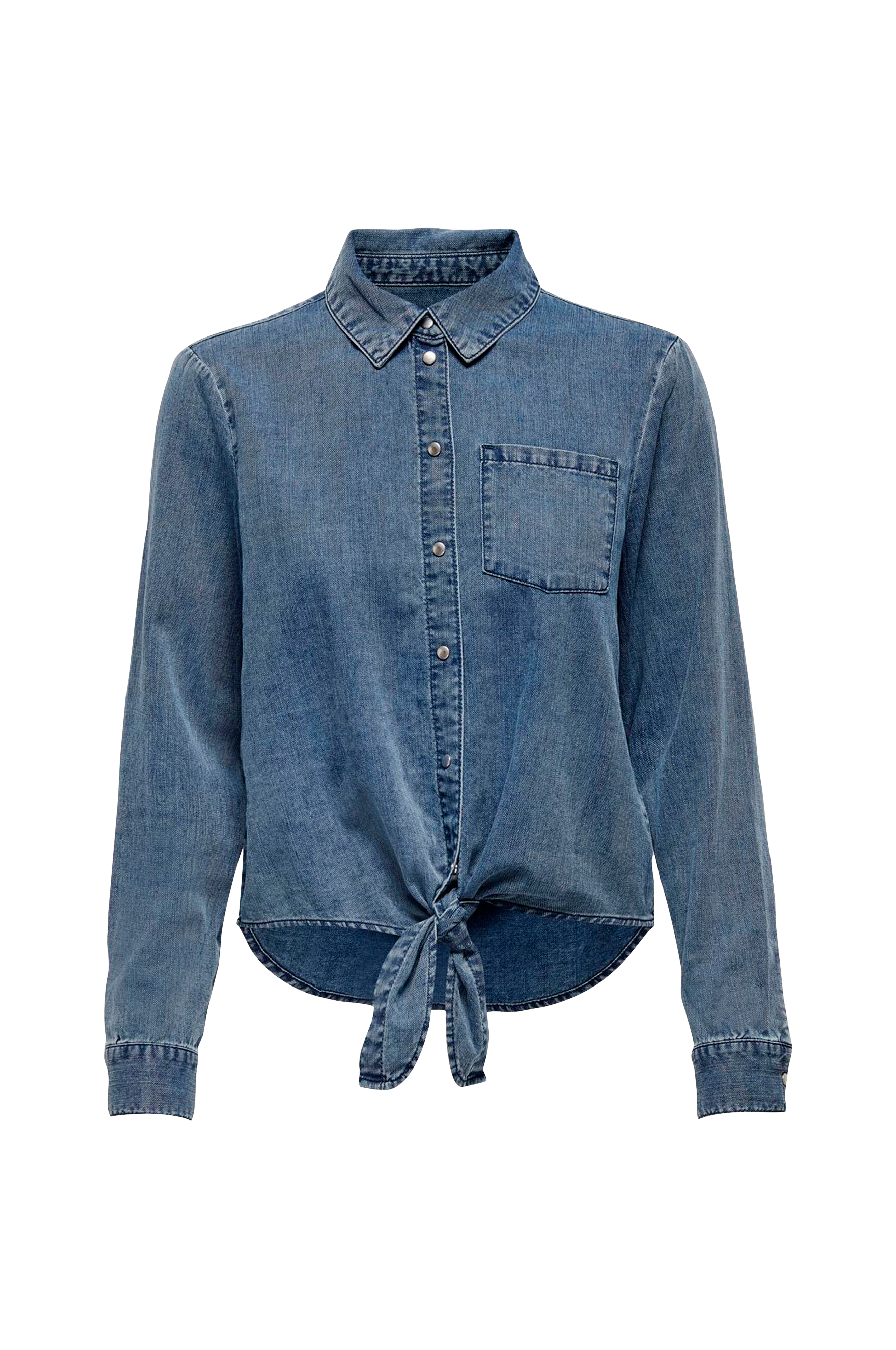 Jeansskjorte i kort modell med knyting nederst foran. Trykknapper og en brystlomme. Lange ermer med mansjett og knapp i ermekantene.