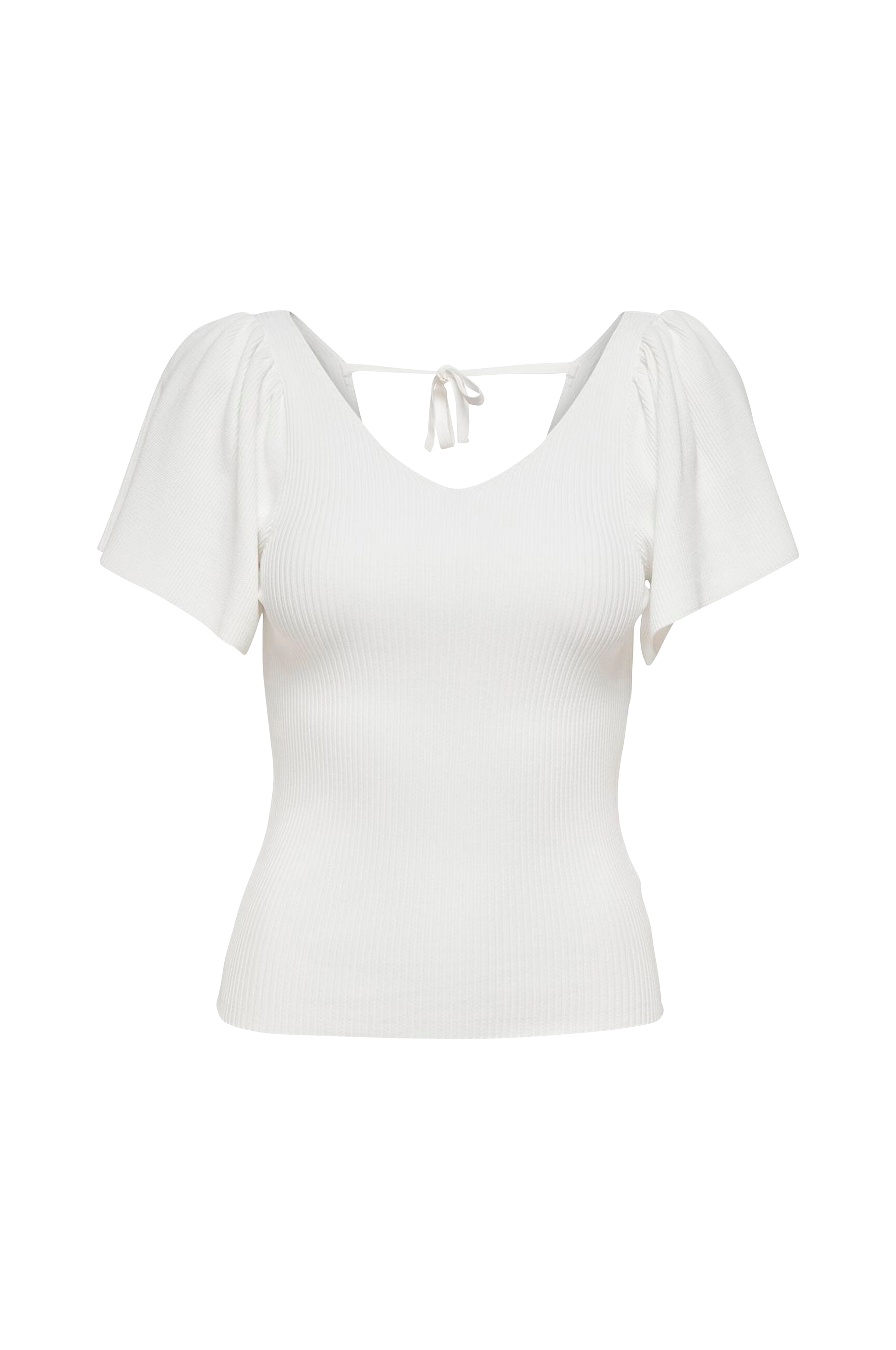 Ribbestrikket topp med V-utringning både foran og bak og korte sommerfuglermer. Knytebånd i nakken.
