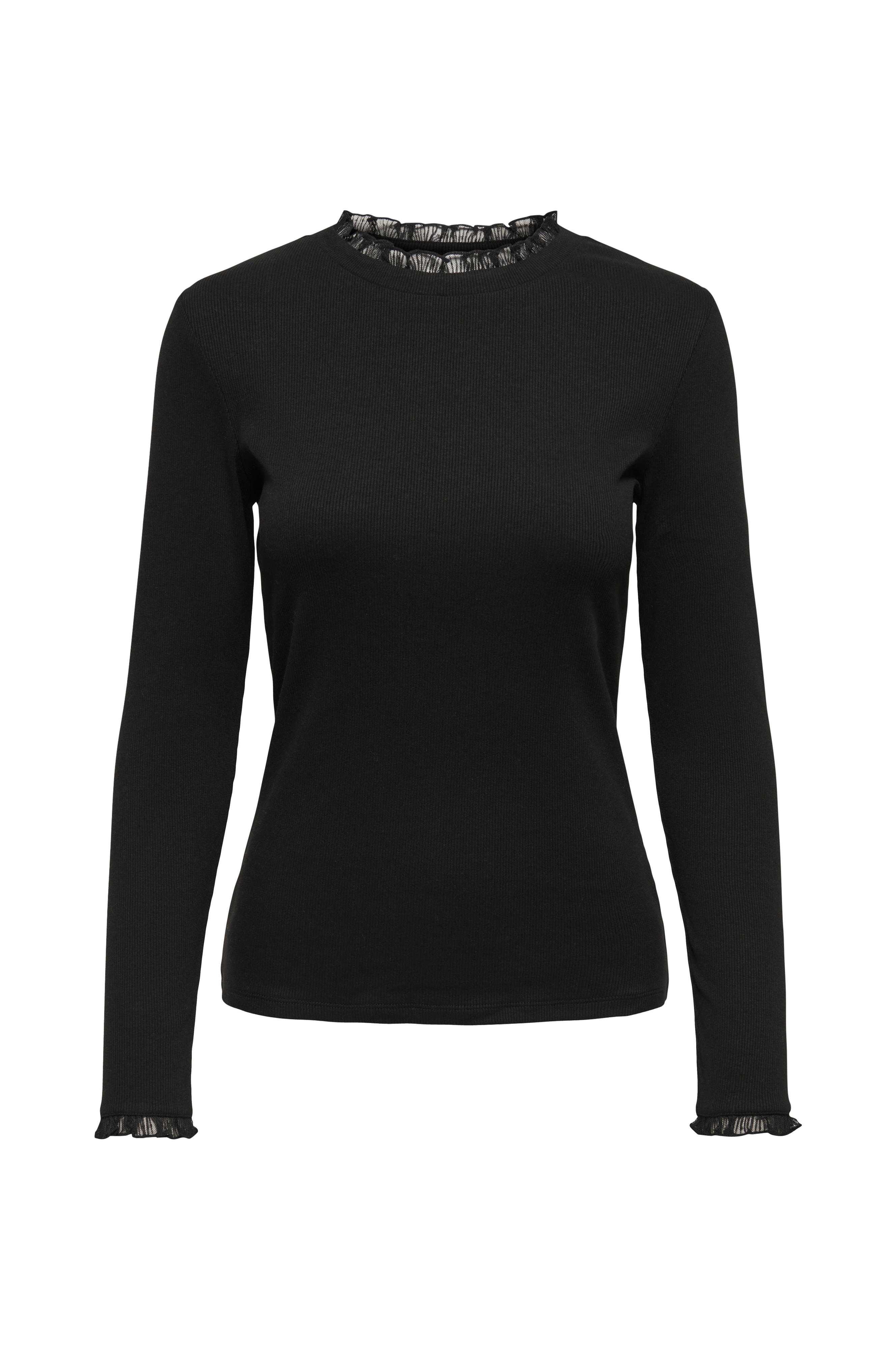 • Ettersittende, ribbestrikket modell• Hals med blondekant• Erme med blonder ved armenden