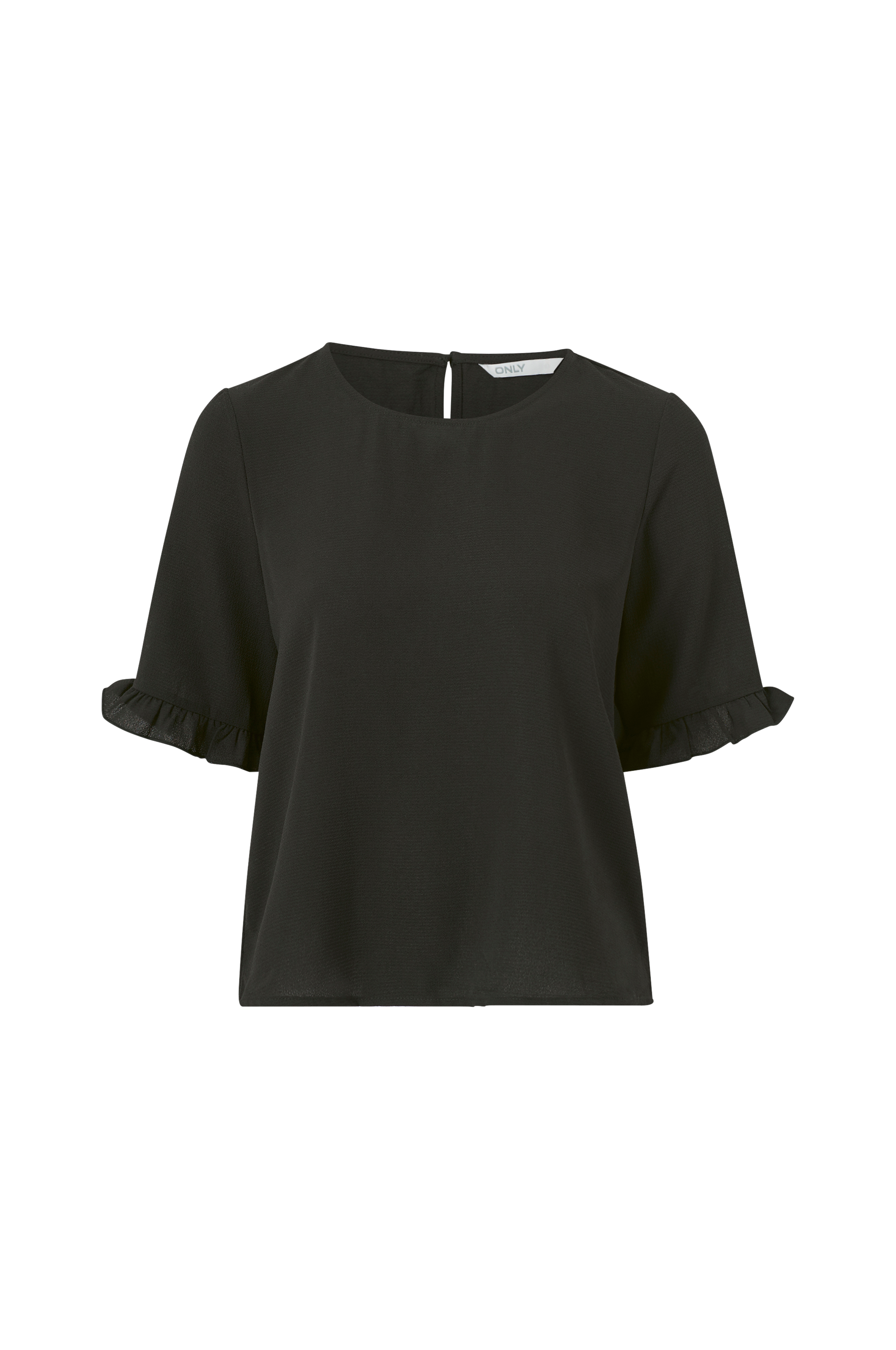 Topp i rett modell av vevd kreppkvalitet med halvlange ermer som har påsydd volang i kanten. Rund hals med splitt og knapp i nakken.