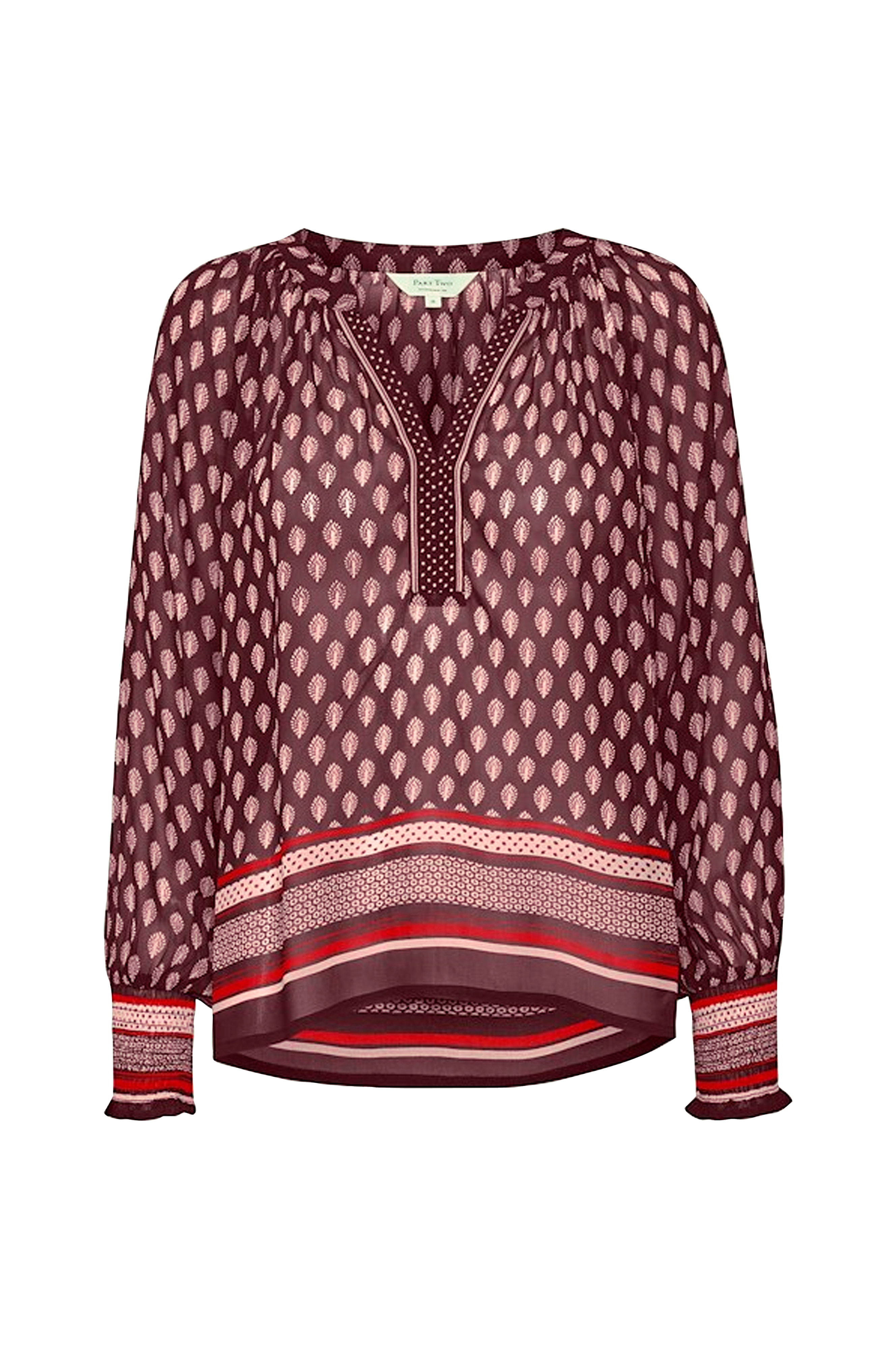 • Rett, bred modell i chiffon• Rund hals med rysjer rundt og v-hals snitt foran• Bredt raglanerme med elastisk vaffelsøm i ermeslutten
