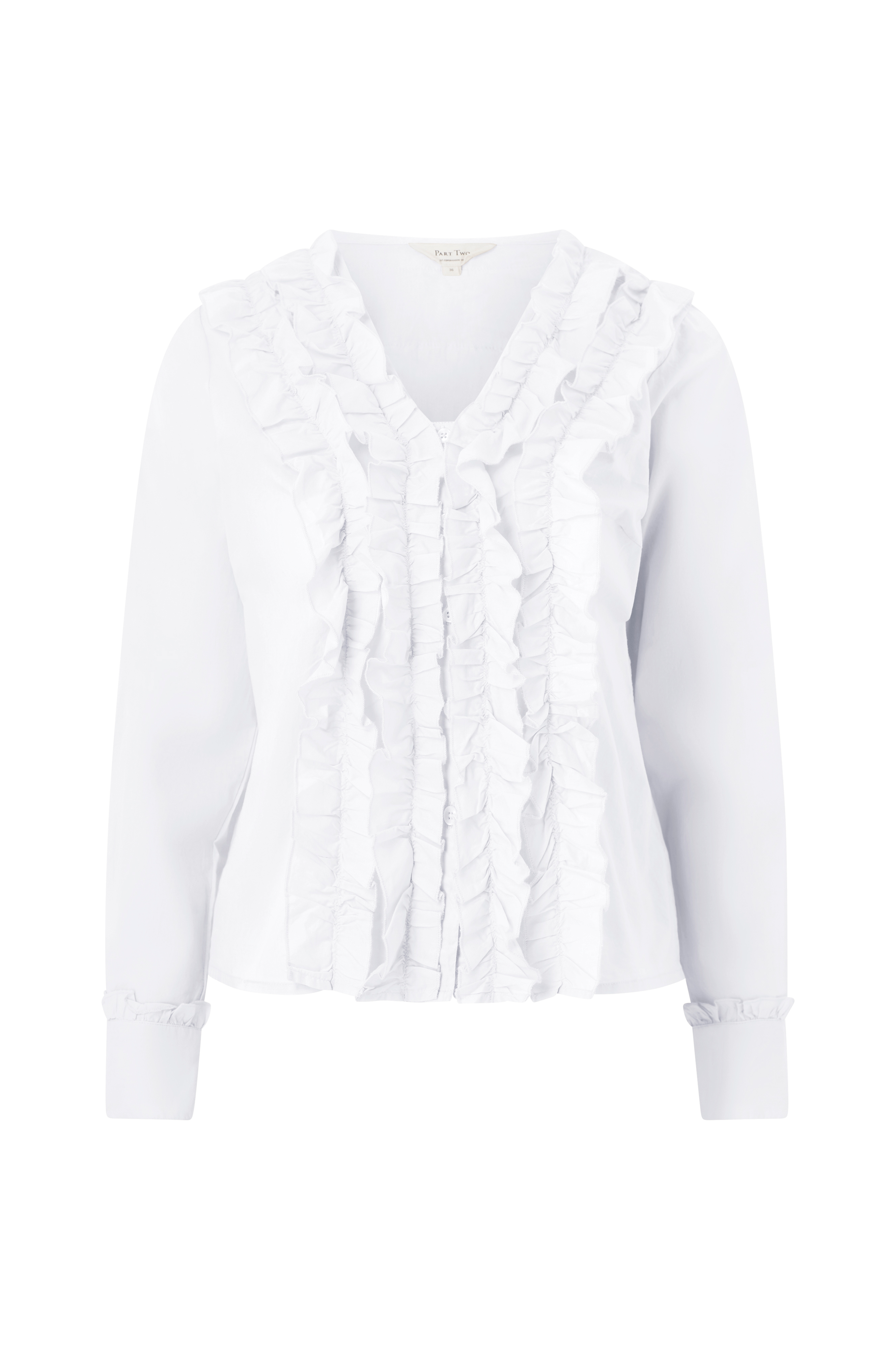 • Rett modell• V-formet hals• Påsydde volanger foran• Langt erme med mansjett