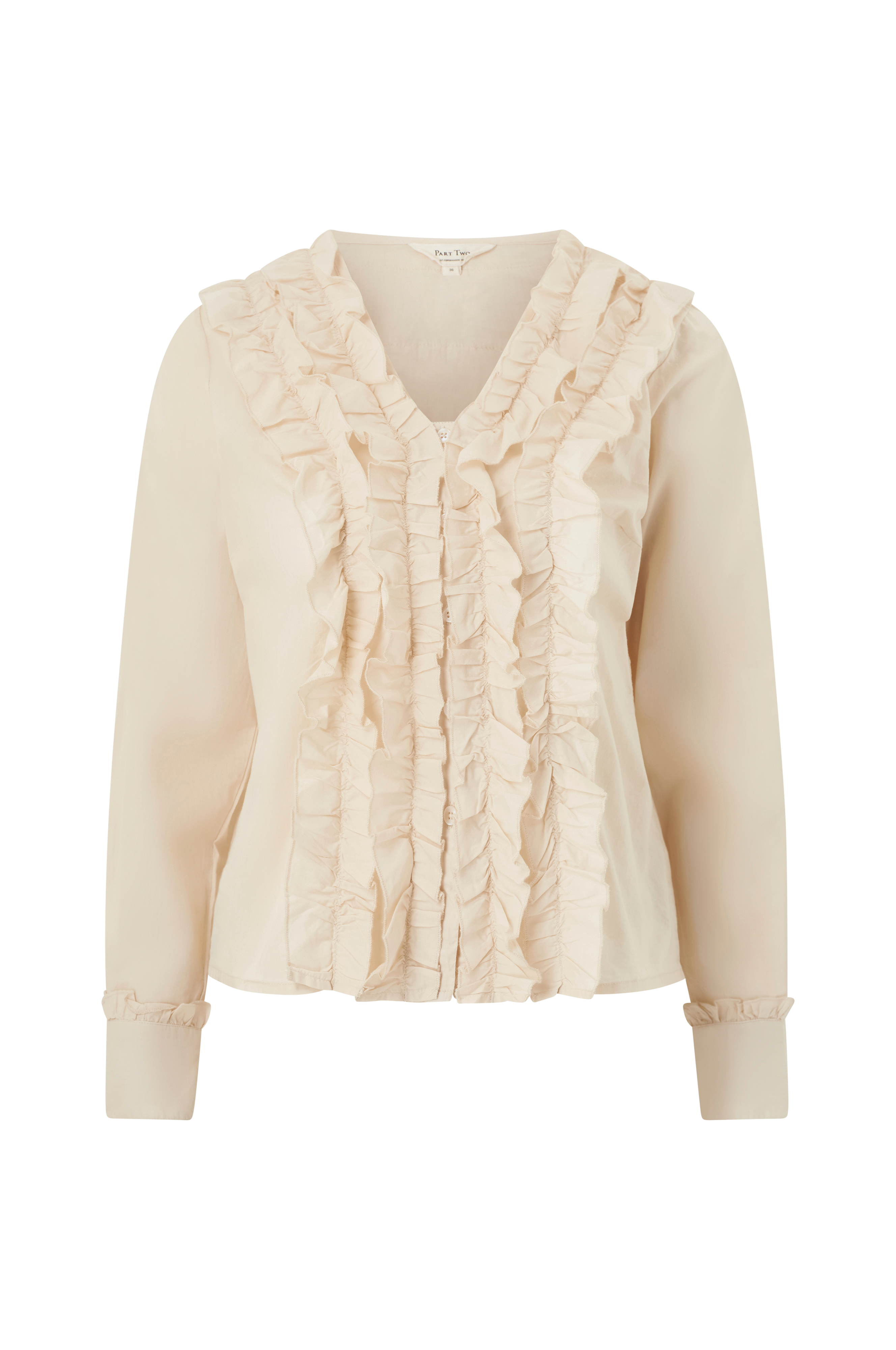 • Rett modell• V-formet hals• Påsydde volanger foran• Langt erme med mansjett