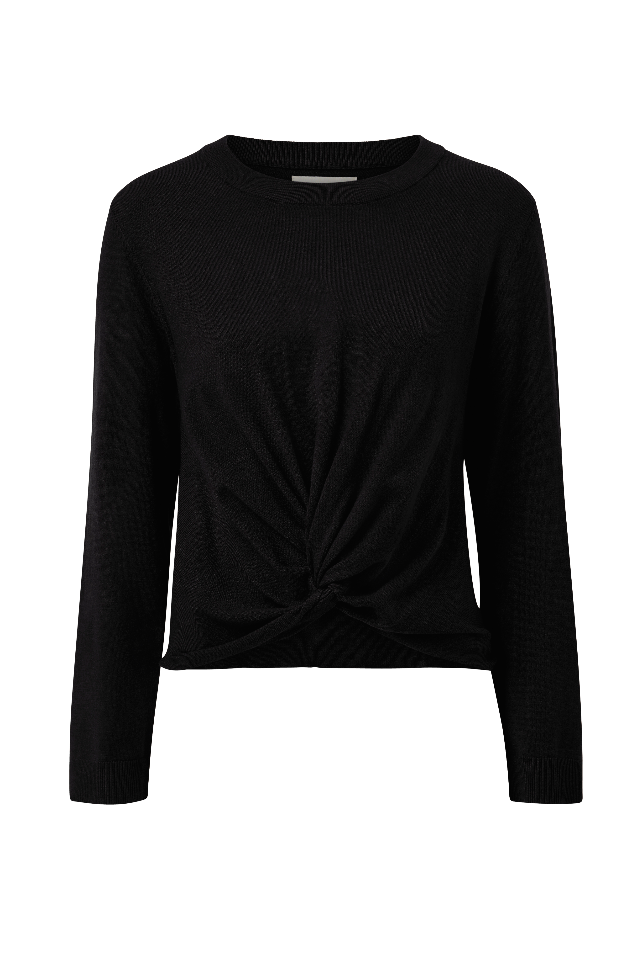 Genser VavarasPW Pullover fra Part Two. Finstrikket modell i litt tynt garn med rund hals med vrangbord. Diagonale markeringer nederst samt drapering foran og ribbestrikk bak. Vid, rett modell med vrangbord i halsen og ermekantene.