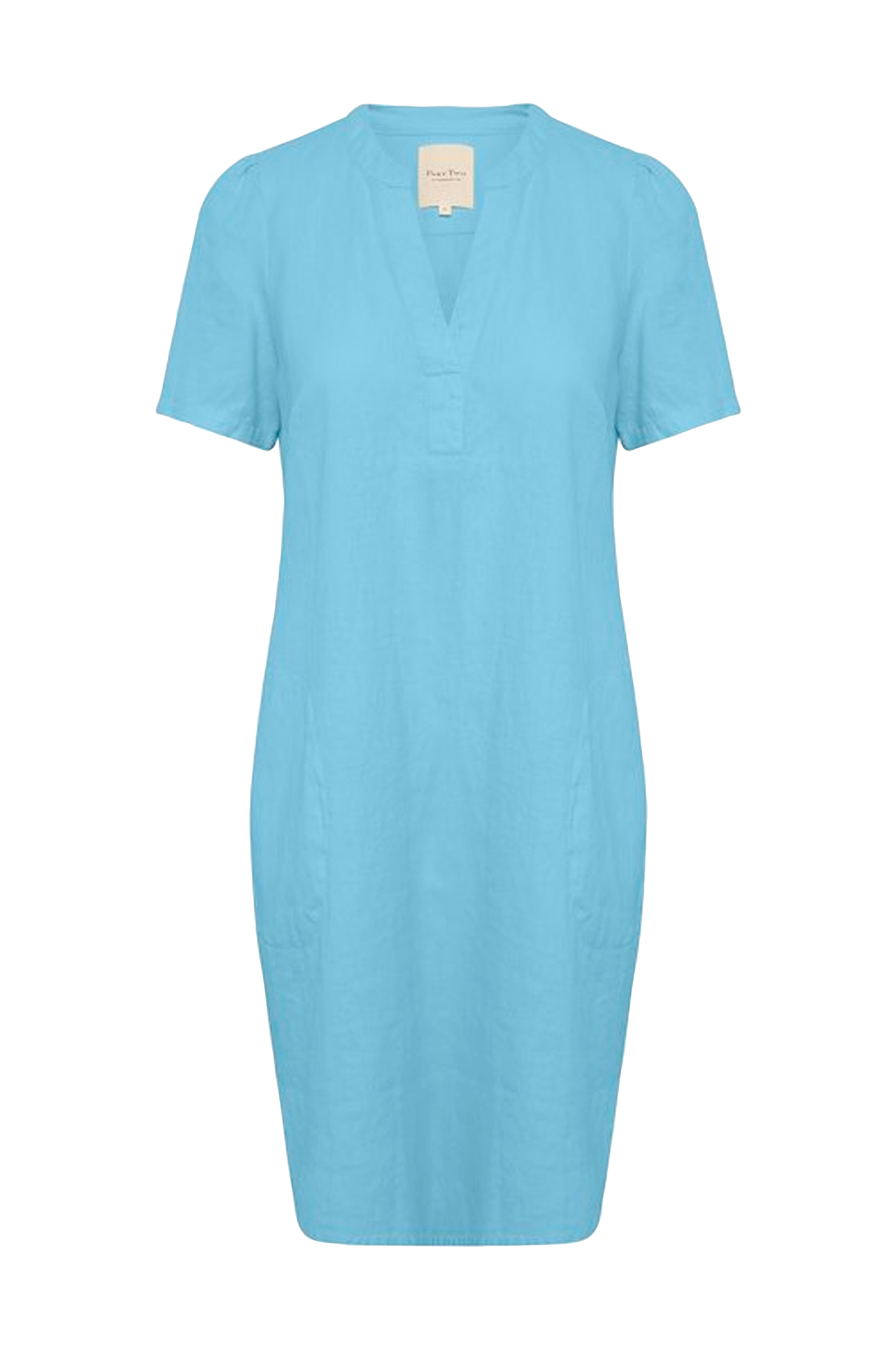 • V-hals snitt• Korte ermer med rysje på skulderen• Lommer i sidene• Avrundede sider med ventilasjon på bunnen• Laget av lin• Lengde: 96 cm i størrelse 36