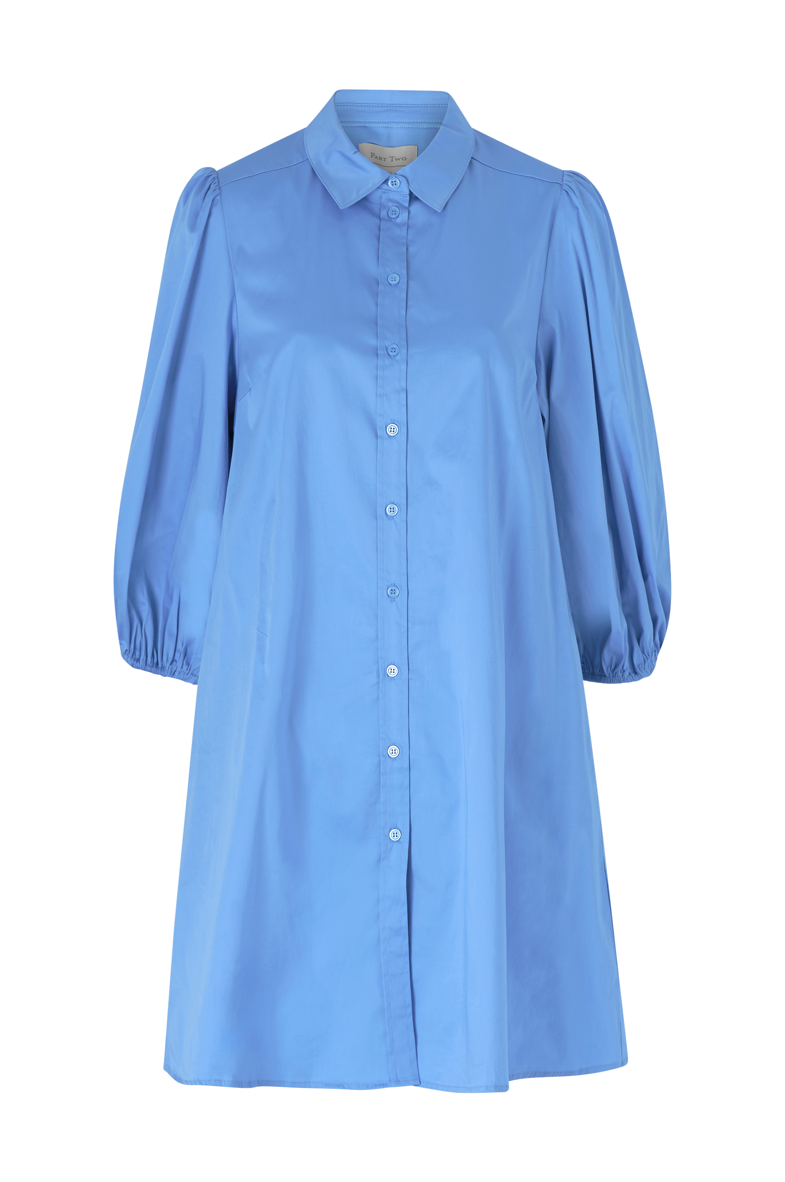 A-linjeformet skjortekjole i vevd bomull med lett stretch. Avslappet stil med knapper foran, lomme i sidene og 3/4-lange ballongermer med elastiske ermekanter. Lengde ca. 98 cm i str 36.