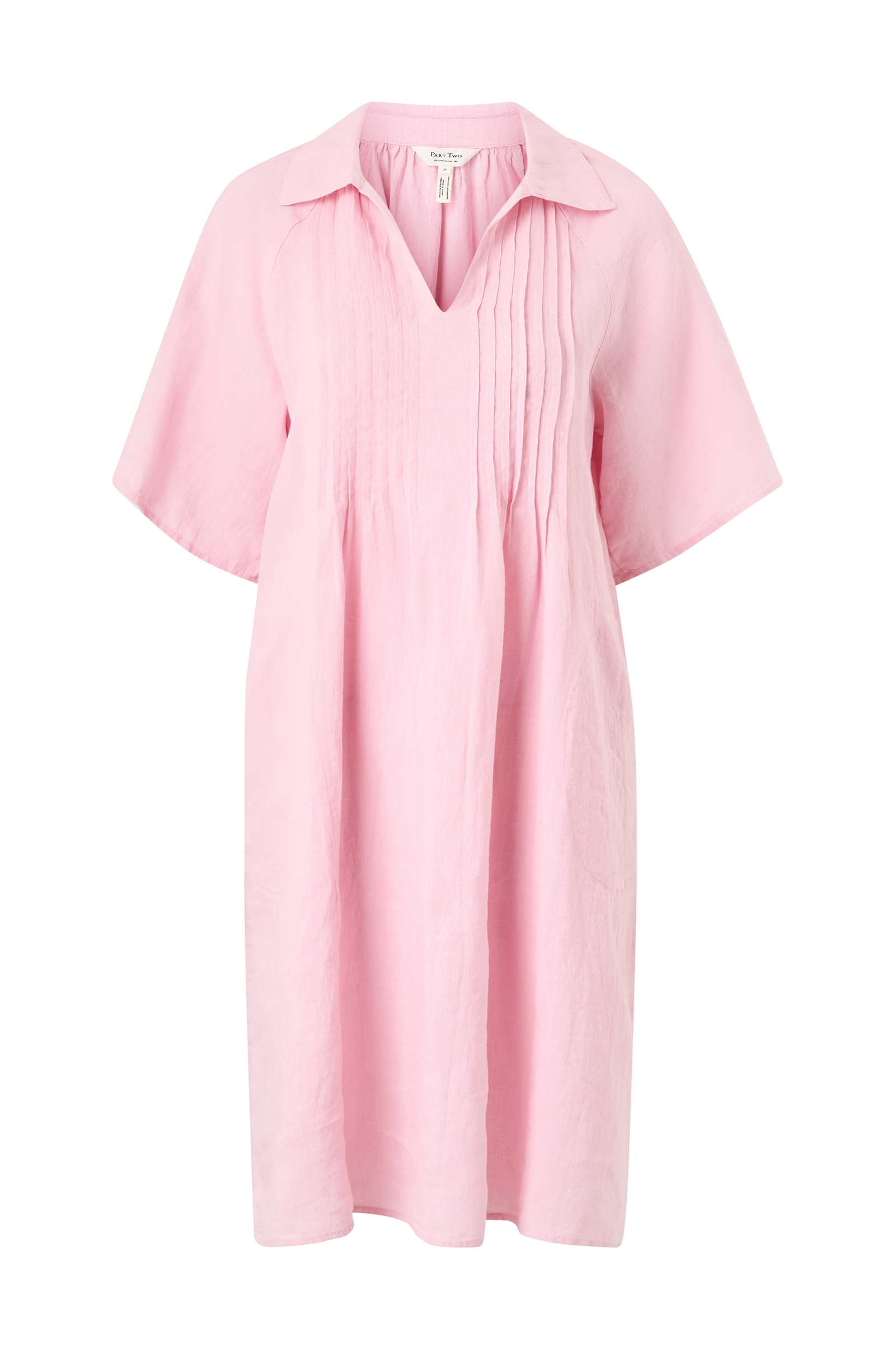 • Kjole i lin• V-hals snitt med krage• Stråfolder oppover foran• Korte ermer• Lommer i sidene• Lengde: 98 cm i størrelse 36