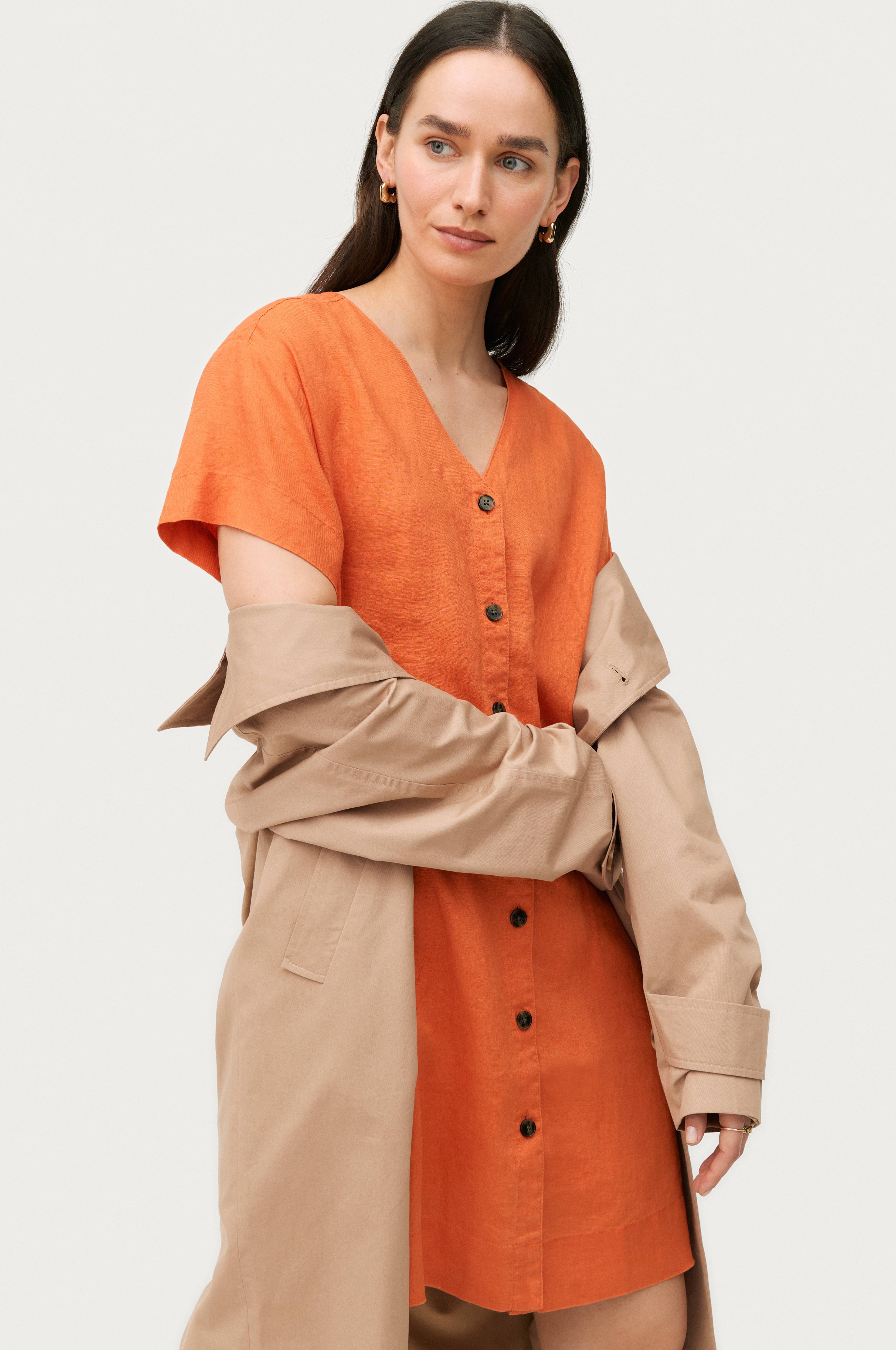 • V-hals snitt• Korte ermer• Knapper foran• Lommer i sidene• Rett passform• Lengde: 93 cm i størrelse 36