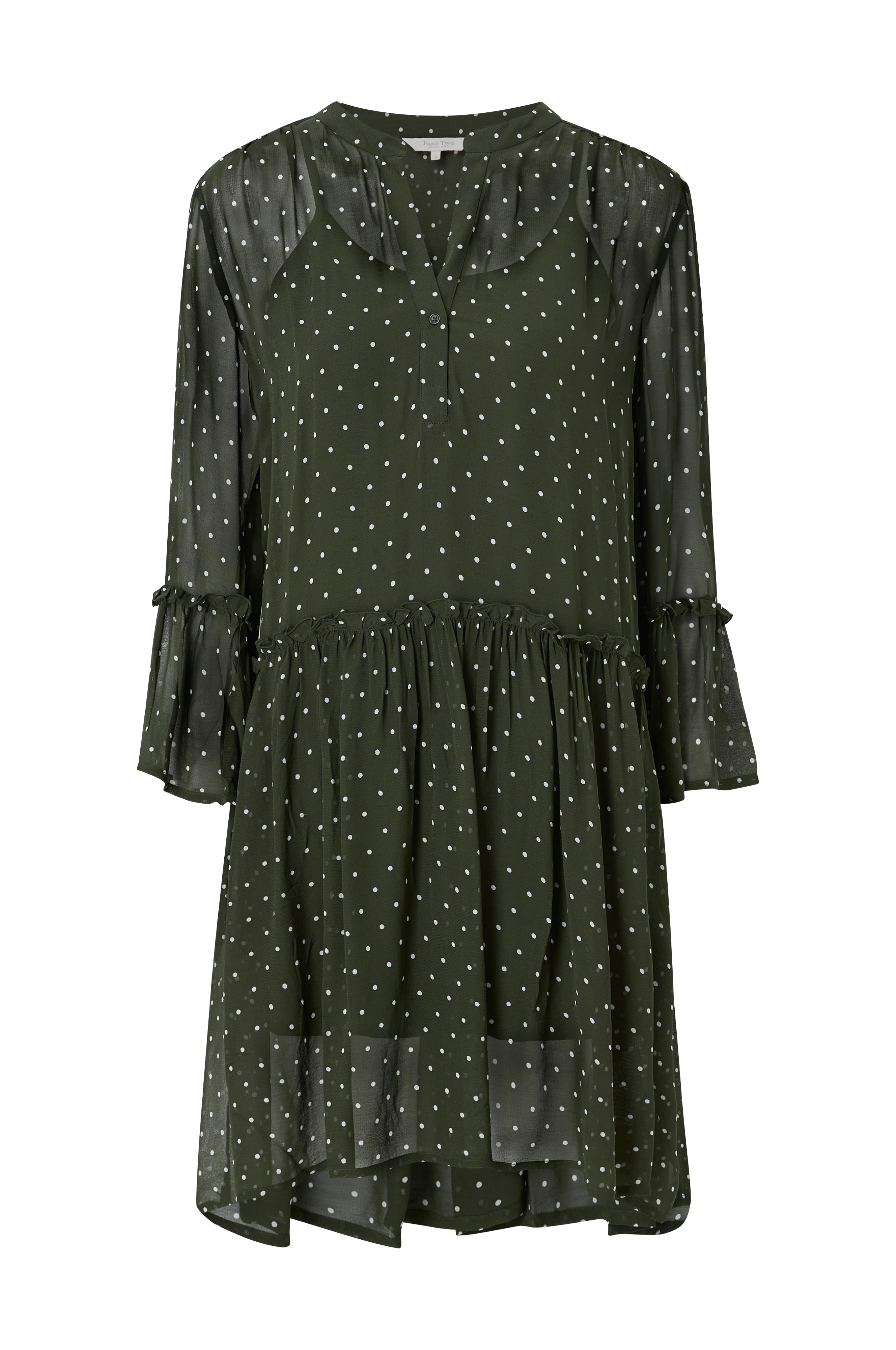 Kjole SophiaPW Dress fra Part Two. Utsvingt modell i vevd chiffon med avskjæring og liten volang på hoften samt vidde i skjørtet. Rund hals med påsydd kant og V-utringning med kort knappestolpe på brystet. Utsvingte, vide ermer med volangkant nederst. Avtagbar underkjole i trikot med smale, regulerbare skulderbånd og rund hals. Lengde bak ca. 100 cm i str 36.