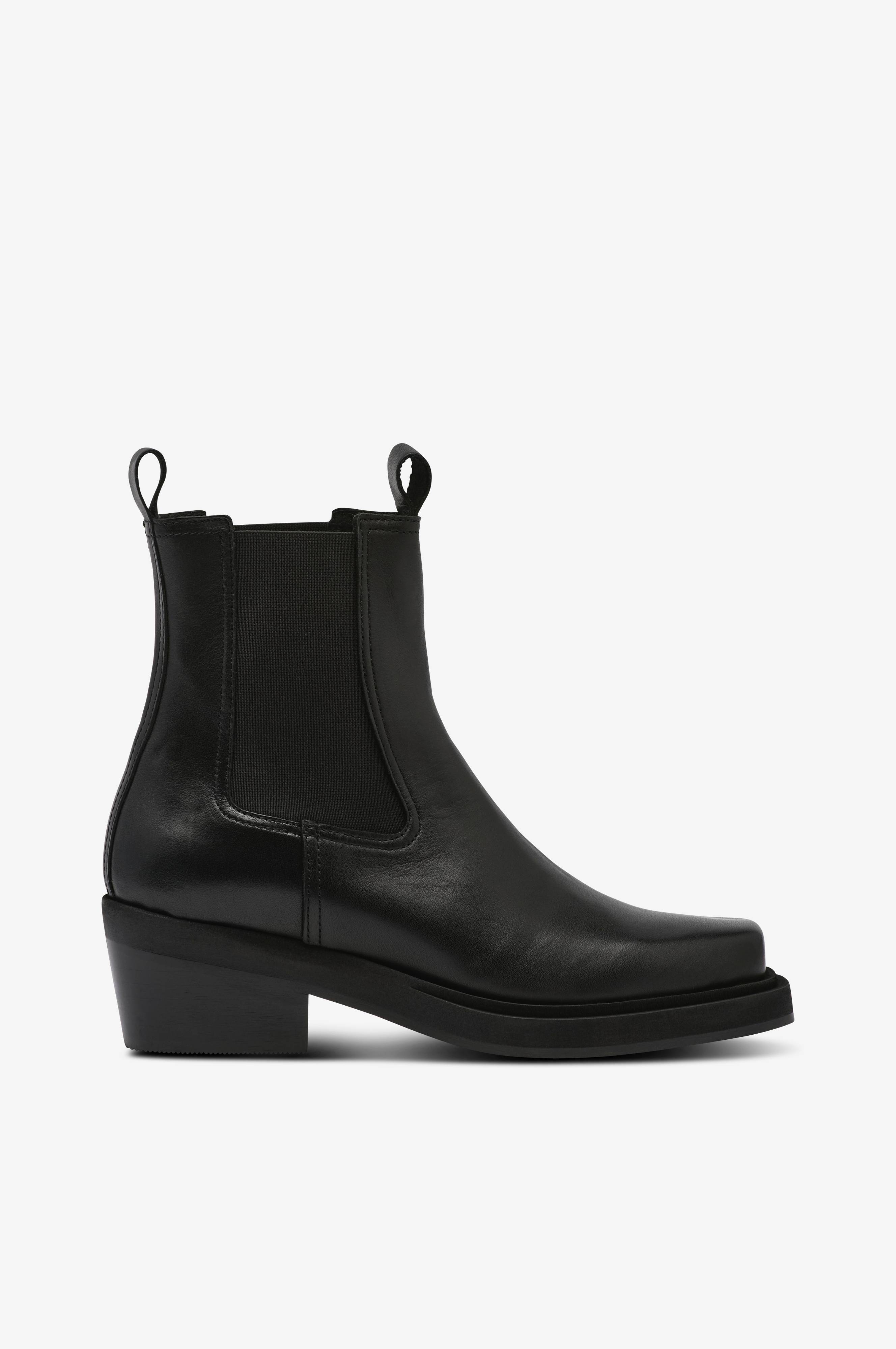 Chelseaboots i mykt semsket skinn med strikkinnfellinger på begge sider av skaftet. Drahemper forn og bak på skaftet. Fôr i skinn og utagbar, skinnkledd innersåle. Skafthøyde ca. 14 cm i str 37. Hælhøyde ca. 3,5 cm.