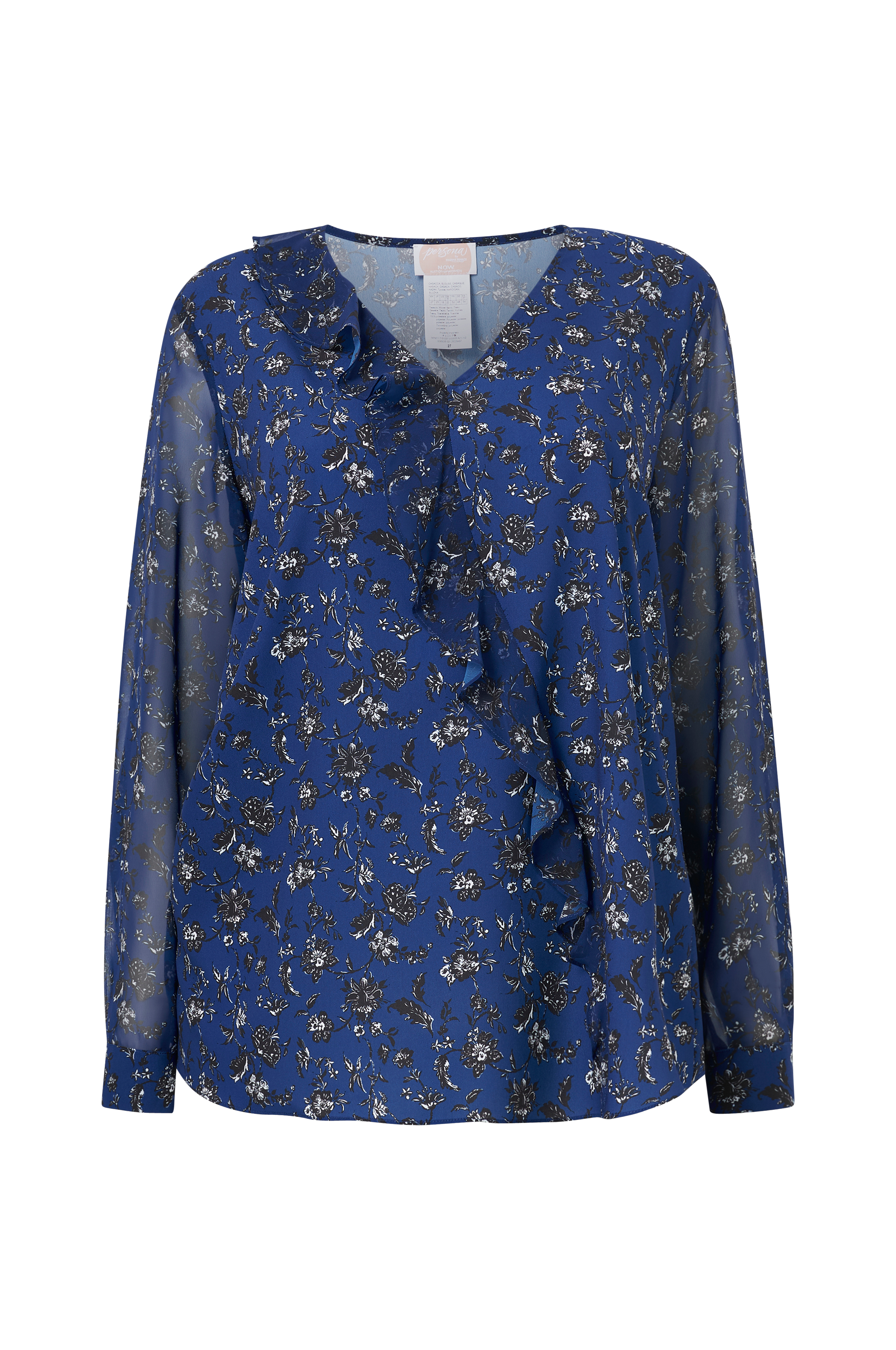 Rett modell i chiffon med V-utringet hals som har bred, påsydd volang ved den ene siden og hele veien foran. Lange ermer med mansjett i ermekantene.
