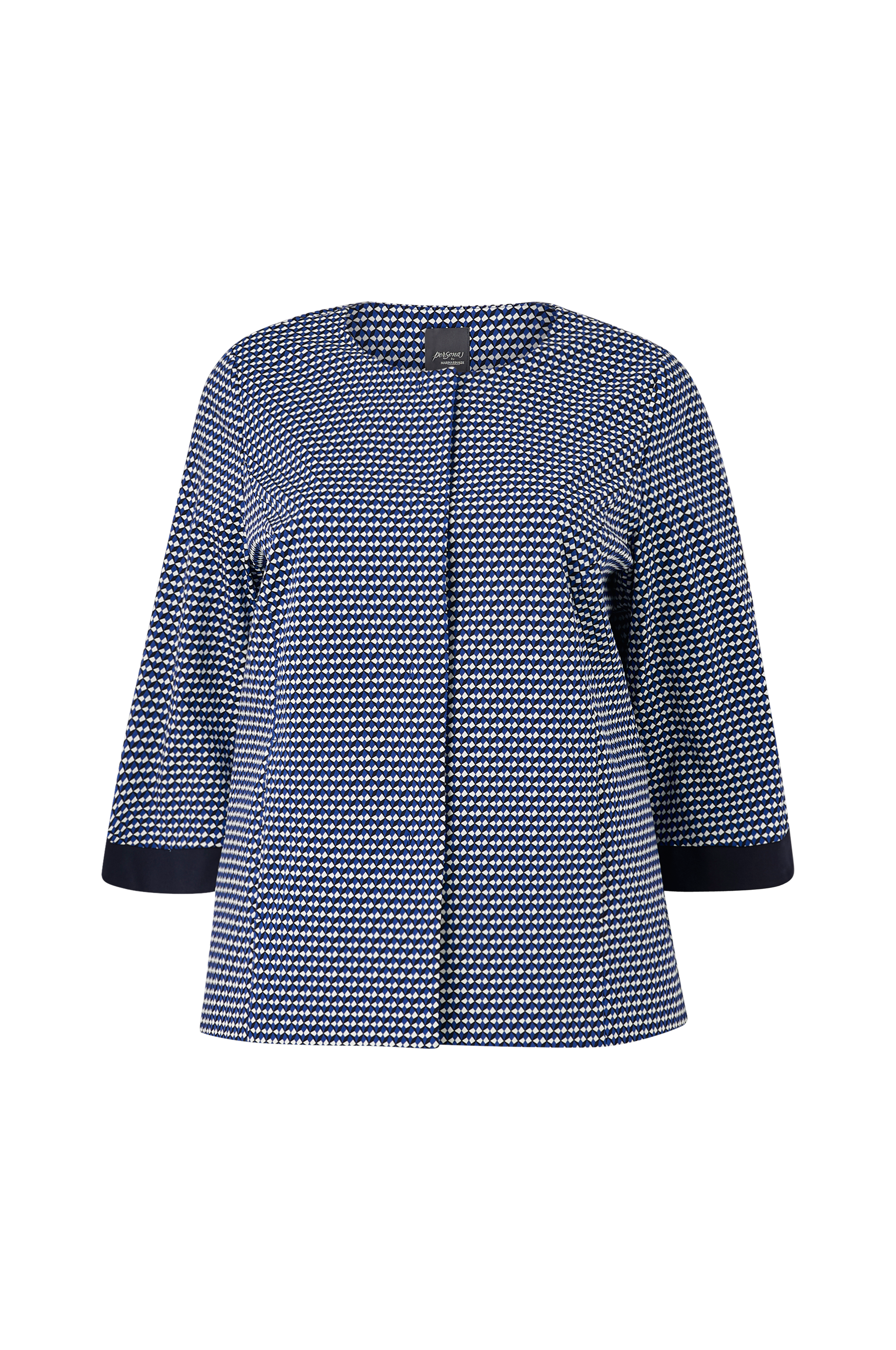 Jakke Cielo fra Persona by Marina Rinaldi i rett modell med skjulte trykknapper og lommer foran. 3/4-lange, vide ermer med ensfarget ermekant med omslagssplitt. Produsert i vevd bomullskvalitet med lett stretch og geometrisk mønster. Fôret. Lengde ca. 72 cm i str 48.