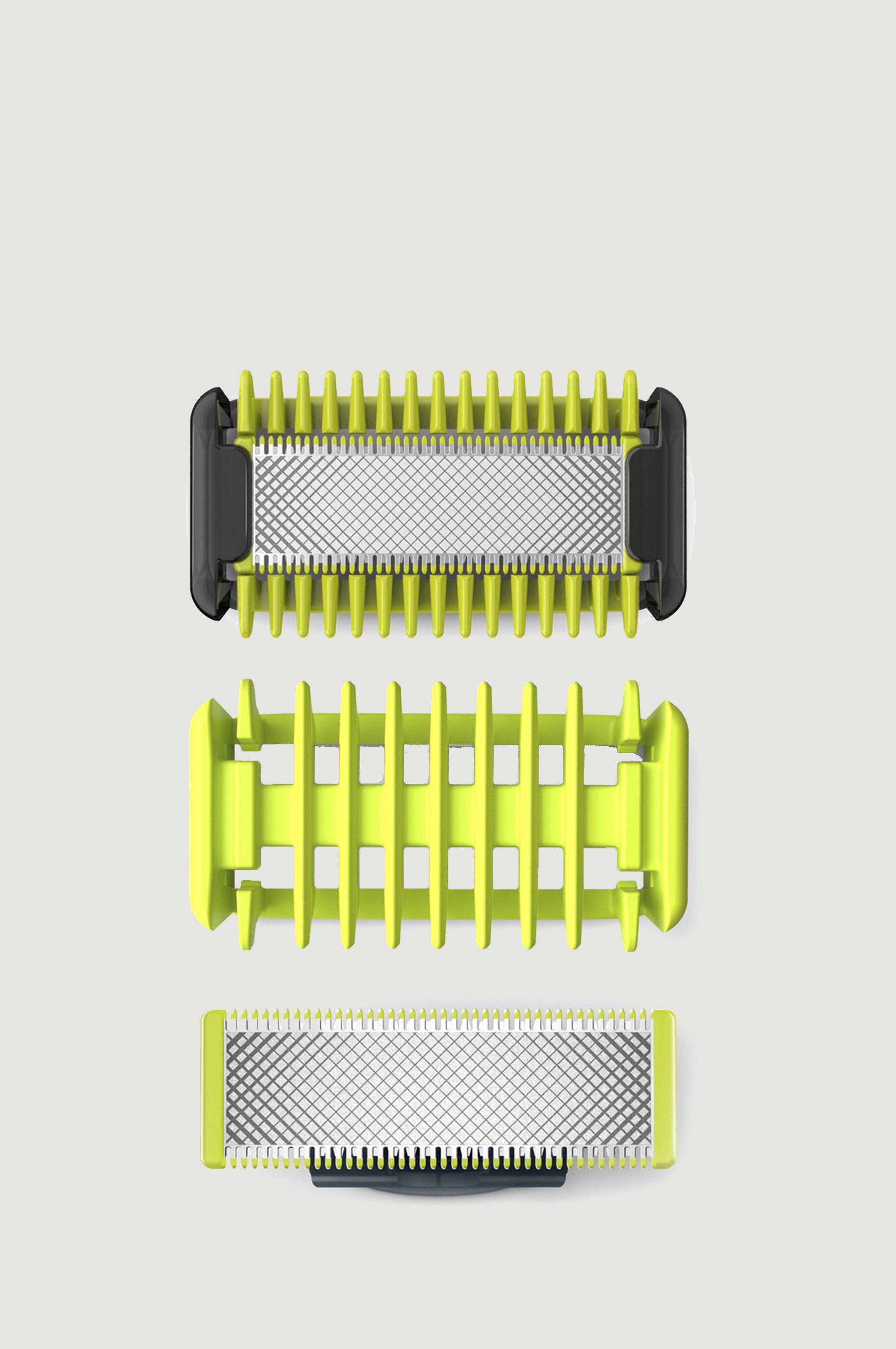 Philips OneBlade ansikt + kropp trimmer og barberer alle hårlengder. Du får et blad til ansiktet, et med hudbeskyttelse til kroppen og en kroppskam. Du trenger ikke flere verktøy. OneBlade greier alt.