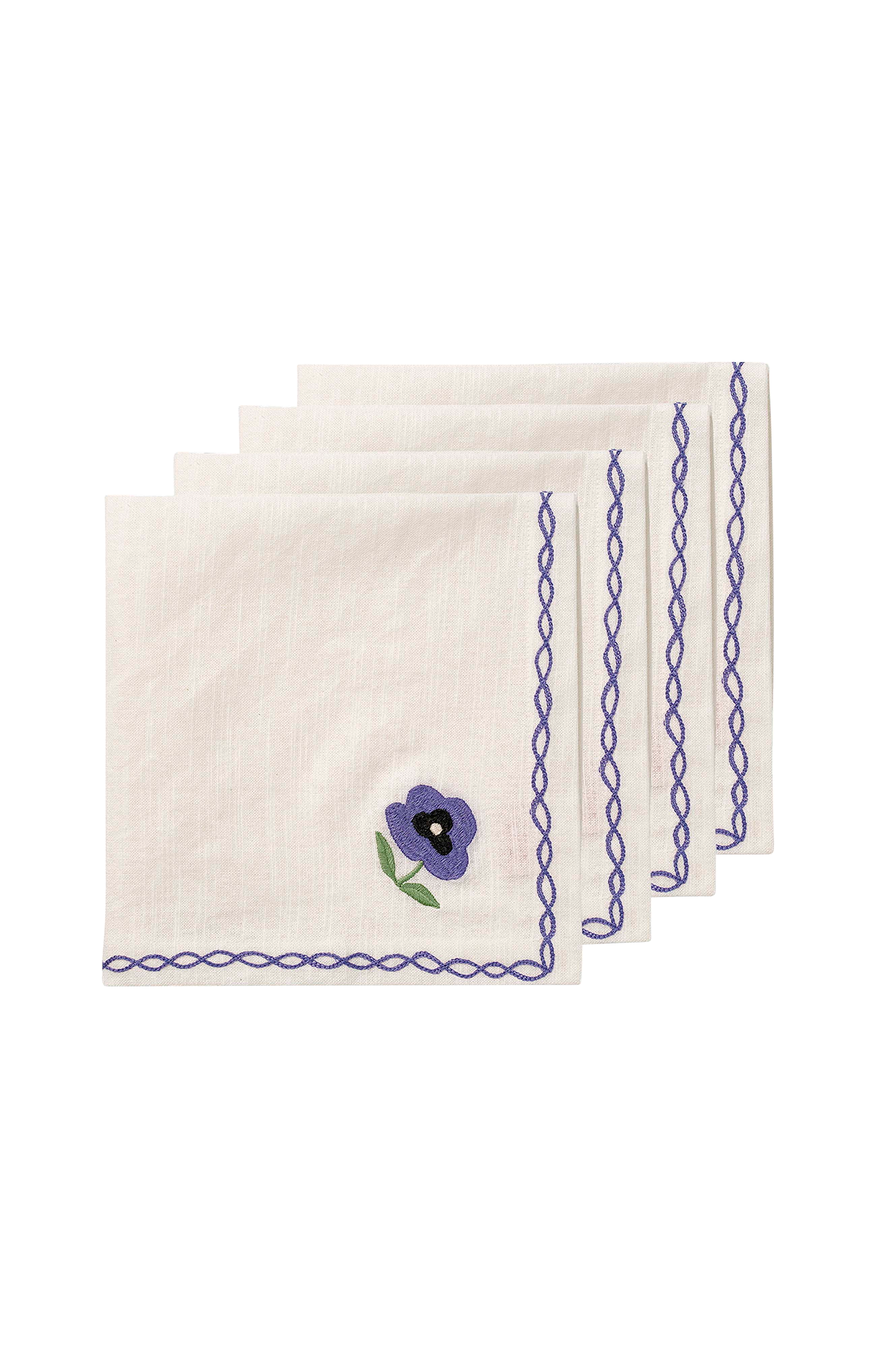 Serviettene Pansy, designet av den svenske designeren og kunstneren Madelen Möllard , gir et snev av vår på bordet med sine blå håndbroderte stemorsblomster. Serviettene selges i sett med fire og er perfekte for å tilføre en blomstrende touch til borddekkingen, til frokost eller festlige sammenkomster.
