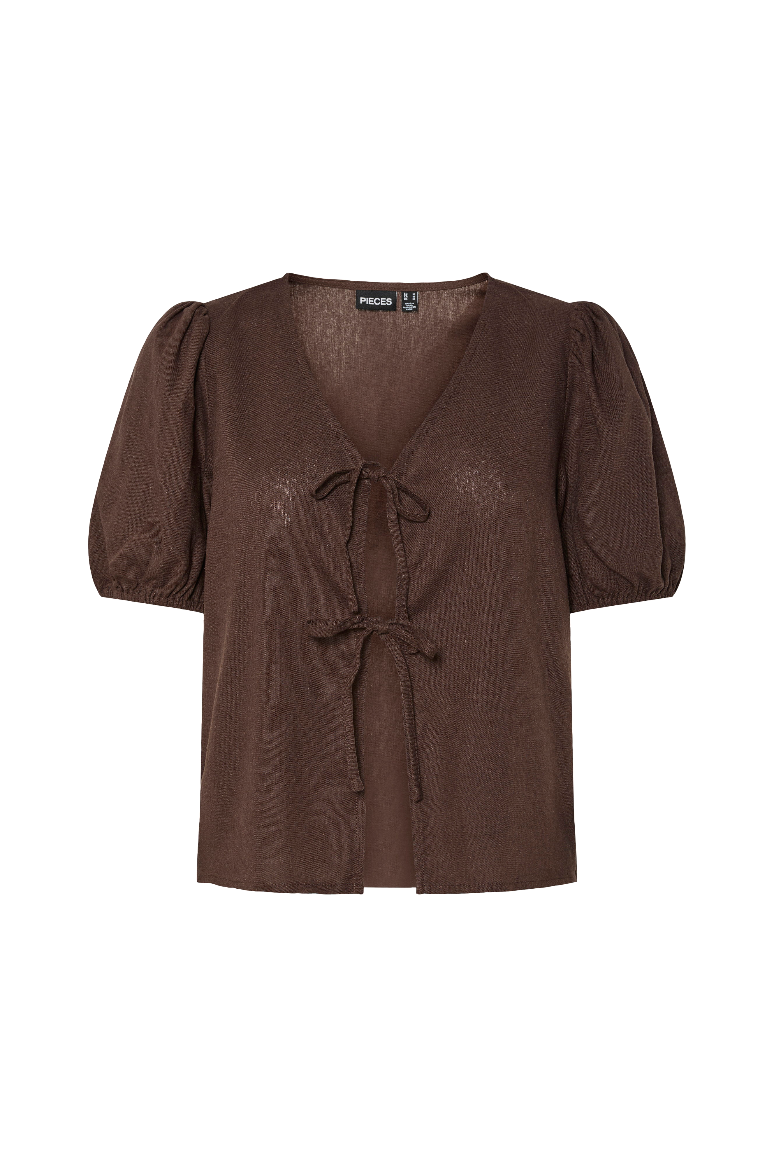 • Bluse i linmiks med korte puffermer• Gummistrikk i ermeslutten• V-formet hals• Knutelukking foran