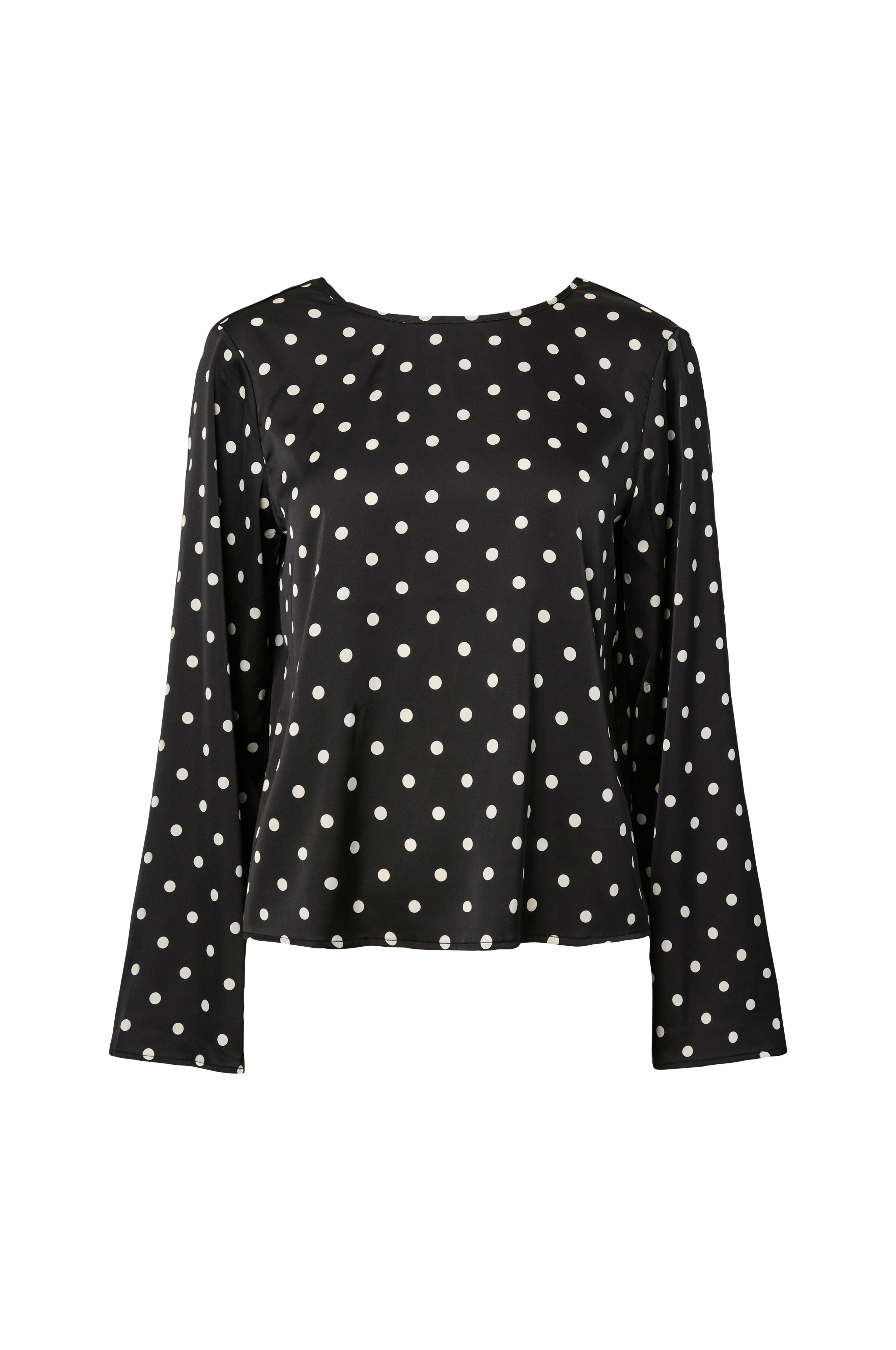 • Satengbluse med prikkmønster• Rund hals med v-hals snitt i ryggen• Lange trompetermer